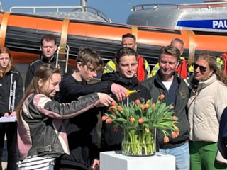 De Tara-tulpen zijn uiteindelijk op de Waddenzee, op de plek waar het fatale ongeval in 2022 plaatsvond, in zee gelegd, waarbij de vrijwillige redders van KNRM Vlieland, Terschelling en Harlingen een moment stillagen om Tara -en in haar álle slachtoffers- te gedenken. De bos was door meerdere reddingboten – in estafette – van Noordwijk naar Den Helder gevaren. Vanaf Den Helder deed de reddingboot van Vlieland het laatste deel van de vaarreis. De KNRM’er die toentertijd de daadwerkelijke reanimatie op zich nam, bleef de gehele reis bij de tulpenbos. Hij sprong tussen Noordwijk en Den Helder meermalen over van reddingboot op reddingboot.