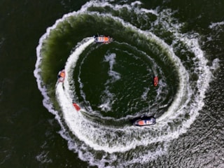 Reddingboten van KNRM-reddingstations Harlingen, Vlieland en Terschelling varen als eerbetoon aan alle overleden niet geredde personen een ronde om de KNRM-tulp ’Tara’ op de Waddenzee. Fotograaf Coen de Jong.