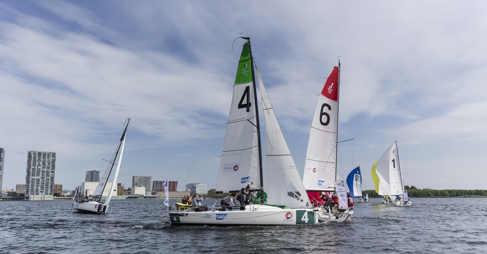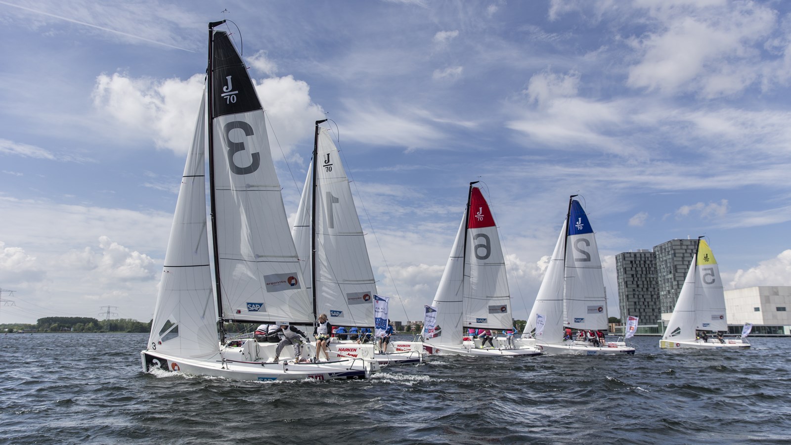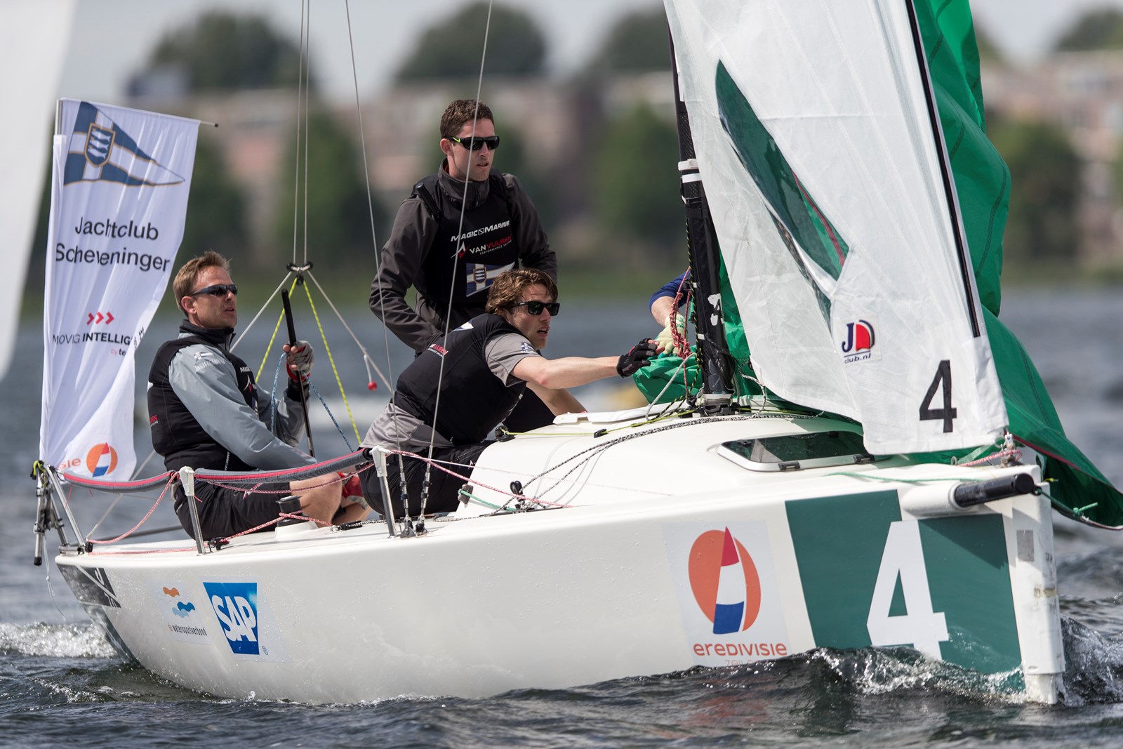 ALMERE– Het zeilteam van Jachtclub Scheveningen voert na de eerste speelronde van de Eredivisie Zeilen, gevaren op het Weerwater in Almere, de strijd om het landskampioenschap aan. De Hagenaren staan drie punten voor op Uitdam, de landskampioen van 2015.