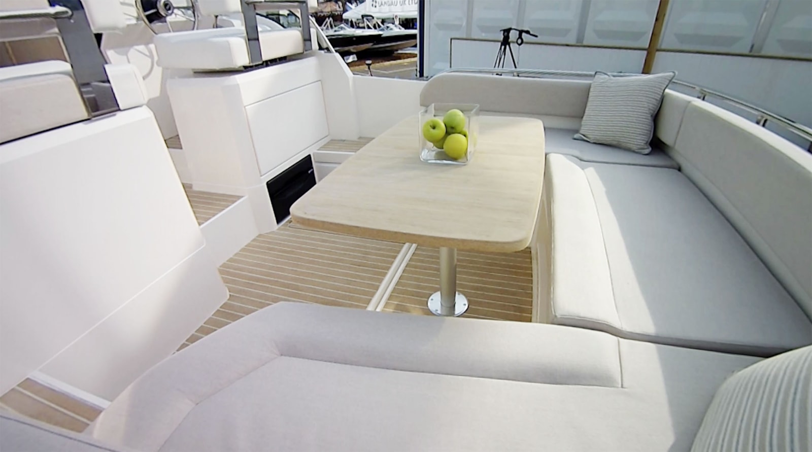 In de kuip tegen de spiegel een U-bank die royaal plaats biedt aan vijf personen. Door een druk op de knop scharniert de vloer compleet met bank omhoog waardoor je gemakkelijk bij de motor kunt. Verder naar voren de cockpit met hierin de stuurstand aan stuurboord met onder de stoel de mogelijkheid voor een koellade. Aan bakboord een ruime meevaardersplaats waar optioneel een grill kan worden gemonteerd.