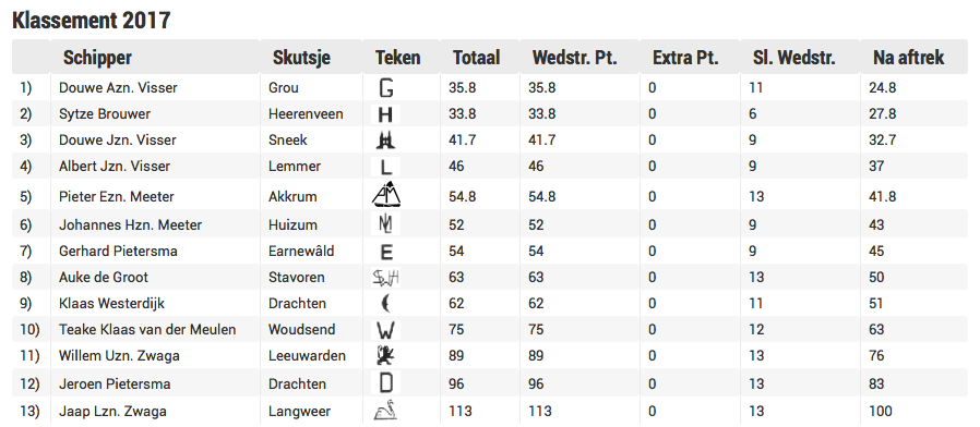 Opnieuw ging de overwinning naar Sytze Brouwer met de Gerben van Manen van Heerenveen. Hij rekende keurig af met de opnieuw sterk zeilende Pieter Meeter van Akkrum en Johannes Meeter op de skûtsje van Huizum, het dorp dat ooit door de Friese hoofdstad Leeuwarden werd ingelijfd en gedegradeerd tot wijk. Lemmer viel terug naar de negende plaats, zijn slechtste resultaat tot nu toe. Er lijken nog vier kandidaten voor een podiumplaats te zijn: Douwe Visser (Grou) leidt met drie punten voorsprong op Sytze Brouwer, die weer 4,9 punten voorsprong heeft op Douwe Visser (Sneker Pan). Albert Visser (Lemmer en broer van Douwe Sneek) is zo goed als uitgesloten als kandidaat voor de titel, want hij staat 12,2 punt achter de klassementsleider. Er wordt tijdens de alles beslissende race, vrijdagmiddag op het Sneekermeer, harde wind verwacht.