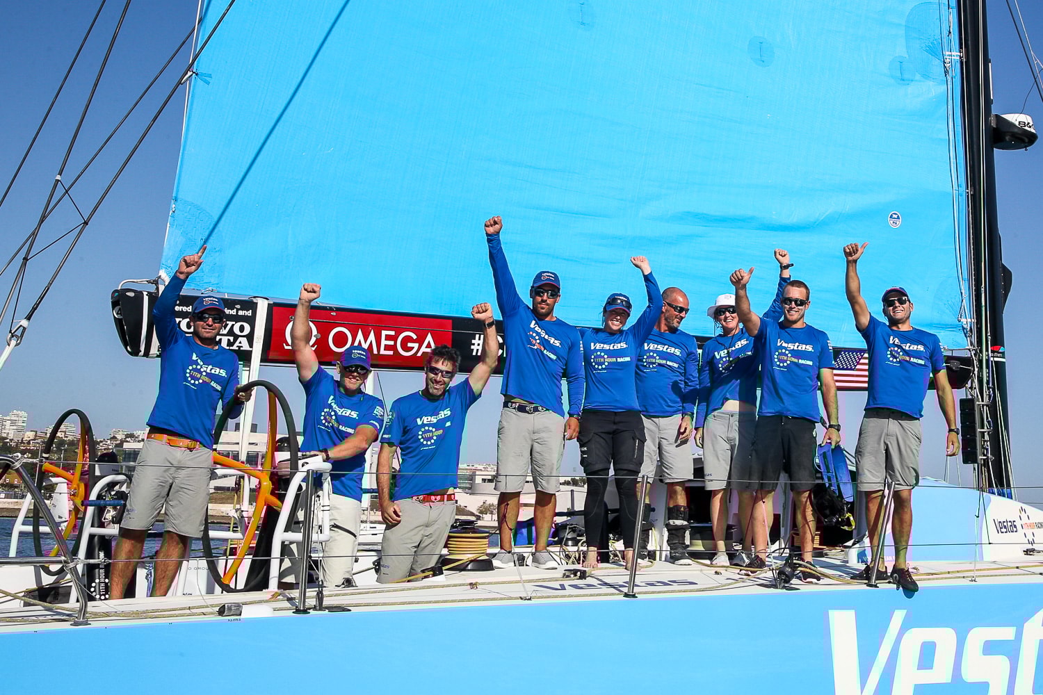 LISSABON- Team Vestas is zaterdagmiddag als eerste over de finish gekomen van leg 1 van de Volvo Ocean Race. De blauwe boot kwam met een riante voorsprong in Lissabon aan.