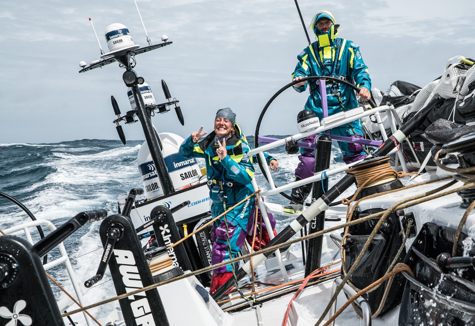 Als gevolg van de verplaatste AIEZ schoof de vloot gedurende het weekend in elkaar. Vestas 11th Hour Racing-navigator Simon Fisher: “Het effect was een enorme compressie. We hebben boten achter ons van bijna 100 mijl achterstand terug zien komen tot amper 20 mijl.” Het Nederlandse team AkzoNobel van schipper Simeon Tienpont profiteerde hier misschien wel het meeste van. Nadat het team vorige week donderdag bij een harde gijp schade aan de mast en de zeilen opliep, zeilde het noodgedwongen een paar dagen enkel op de voorzeilen. Ondertussen werkte de bemanning hard aan de reparaties. De achterstand liep op tot bijna 380 nm, maar op zondag lukte het bij de tweede poging om het grootzeil te hijsen. De Nederlandse Volvo Ocean 65 kon eindelijk de achtervolging inzetten. Inmiddels hebben ze het gat weten te verkleinen tot 220 nm achter Dongfeng en 80 nm tot aan Turn the Tide on Plastic. “We gaan hard en het is ongelofelijk nat”, schreef Tienpont een paar uur nadat ze weer op volle snelheid zeilden.