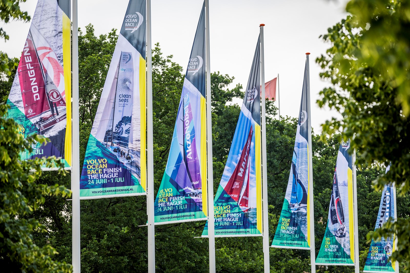 DEN HAAG- Den Haag maakt zich op voor de finish van de Volvo Ocean Race. Het duurt nog een kleine maand voordat de zeven schepen in Scheveningen arriveren, maar inmiddels wapperen in de hele stad al 500 vlaggen. Het klapstuk zijn de zeven grote vlaggen die je kunt bewonderen bij het Centraal Station.