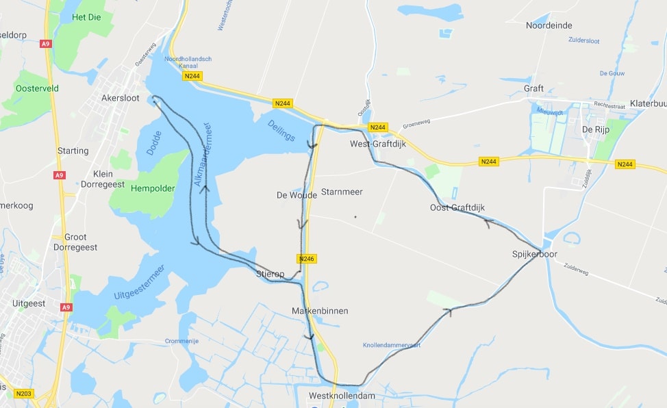 De vaartocht met een sloep begint in Akersloot. Vanaf de haven van de Alkmaarsche Roei-en Zeilvereniging varen we via de Kalverstraat, de doorgang bij het eiland van de Zaanse Zeilvereniging, richting de Stierop. Daar gaan we rechtsaf richting West-Knollendam. Wij gaan de polder in en varen richting Spijkerboor. Een visser in een trapkano haalt net een voorntje binnen. We varen verder over de 3,7 km lange vaart en gaan dan bakboord uit naar Oost en West Graftdijk. Het riet staat hoog, we kunnen vanuit onze sloep nauwelijks de polder in kijken. Bij West Graftdijk kun je afslaan richting de Eilandspolder. Je komt dan in de Schermer, een beschermd werelderfgoed vanwege het unieke landschap dat door eeuwenoud watermanagement op het water is veroverd.