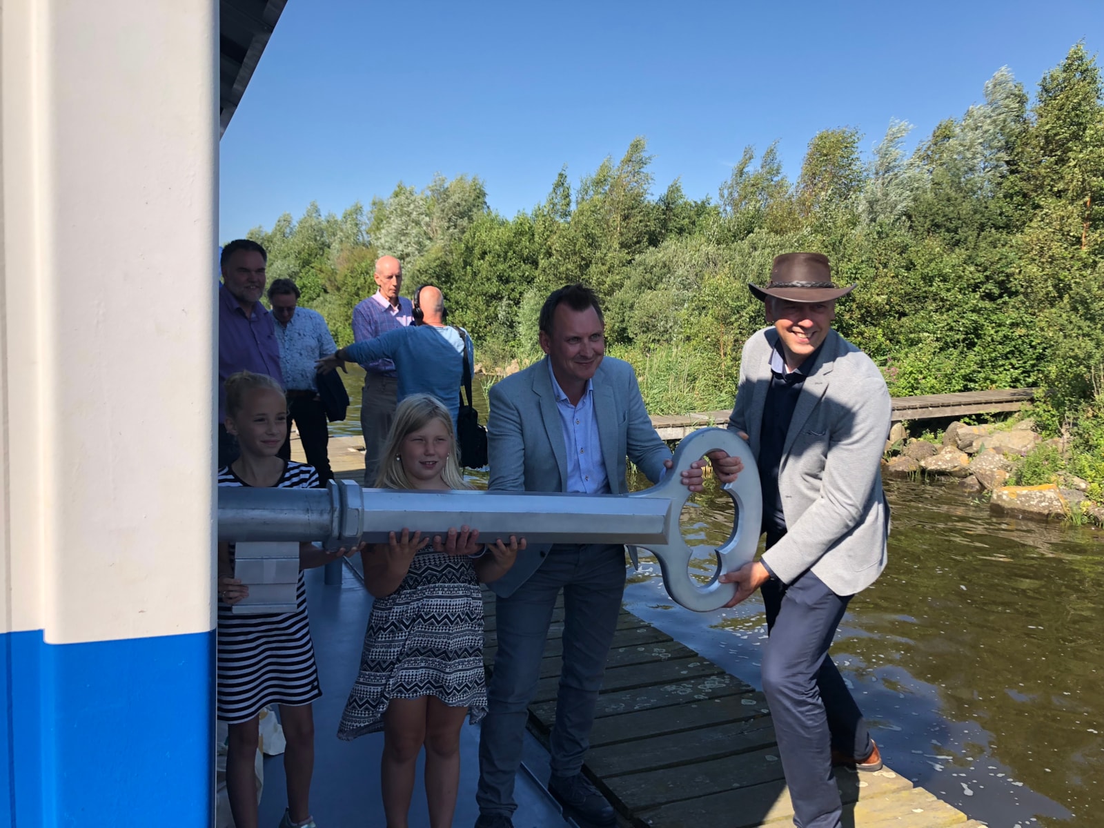 TJEUKEMEER- Donderdag is het eerste vernieuwde drijvende vuilwaterstation ‘It Húske’ geopend door gedeputeerde Michiel Schrier, wethouder Frans Veltman namens Recreatieschap Marrekrite en twee kinderen van basisschool de Reinbôge in Bantegea.