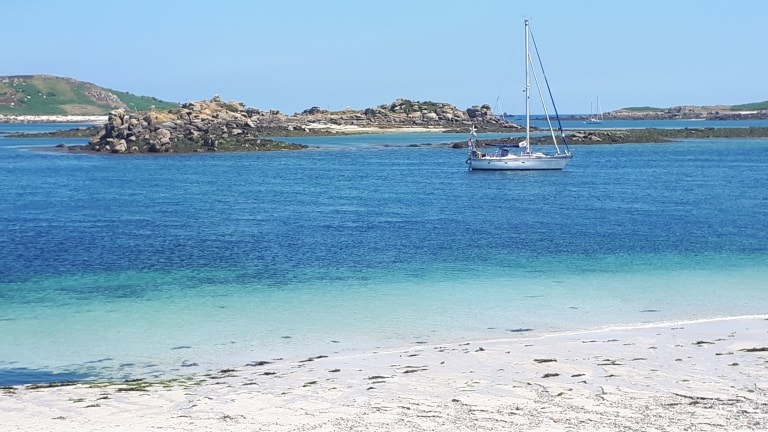 Het regelmatig aankomen en vertrekken hebben beiden een betoverende werking op mij. De natuur bepaalt het verloop van mijn dag. Het niet weten wat je te wachten staat maakt nieuwsgierig en zorgt voor verassingen die mij herhaaldelijk kunnen ontroeren. Ik moet nu bijvoorbeeld denken aan onze aankomst bij het eiland St. Martin’s, De Scillies. Na 2 dagen en nachten op zee is er opeens land in zicht. Vervolgens gooi je het anker uit in kristalhelder azuurblauw water, omgeven door indrukwekkende rotspartijen en spierwitte strandjes. Vol verwondering voor het schitterende landschap, word ik langszij begroet door een zeehond. Zag ik het nou goed, gaf hij mij een knipoog? Met een dubbele wetsuit ben ik te water gegaan. Ondanks de neopreen handschoenen tintelden mijn handen heftig van de kou, boeie…want zwemmen met zeehonden is supergaaf. De flippers van Ronald waren te groot, dus dan maar met de blote voetjes. Pfff…toch een beetje spannend, zullen ze niet in mijn tenen bijten? Al zwemmend met mijn voeten boven water, duhhh…alsof dat helpt, kom ik natuurlijk voor geen meter vooruit, maar trok ik met mijn onhandige gespartel wel de volledige aandacht van deze prachtige beesten. Partytime…!!! Drie nieuwsgierige zeehonden zwemmen onder mij door en tonen hun glanzende zilverwitte buikkies en flapperen net als ik met hun zwemvliezen op het water.