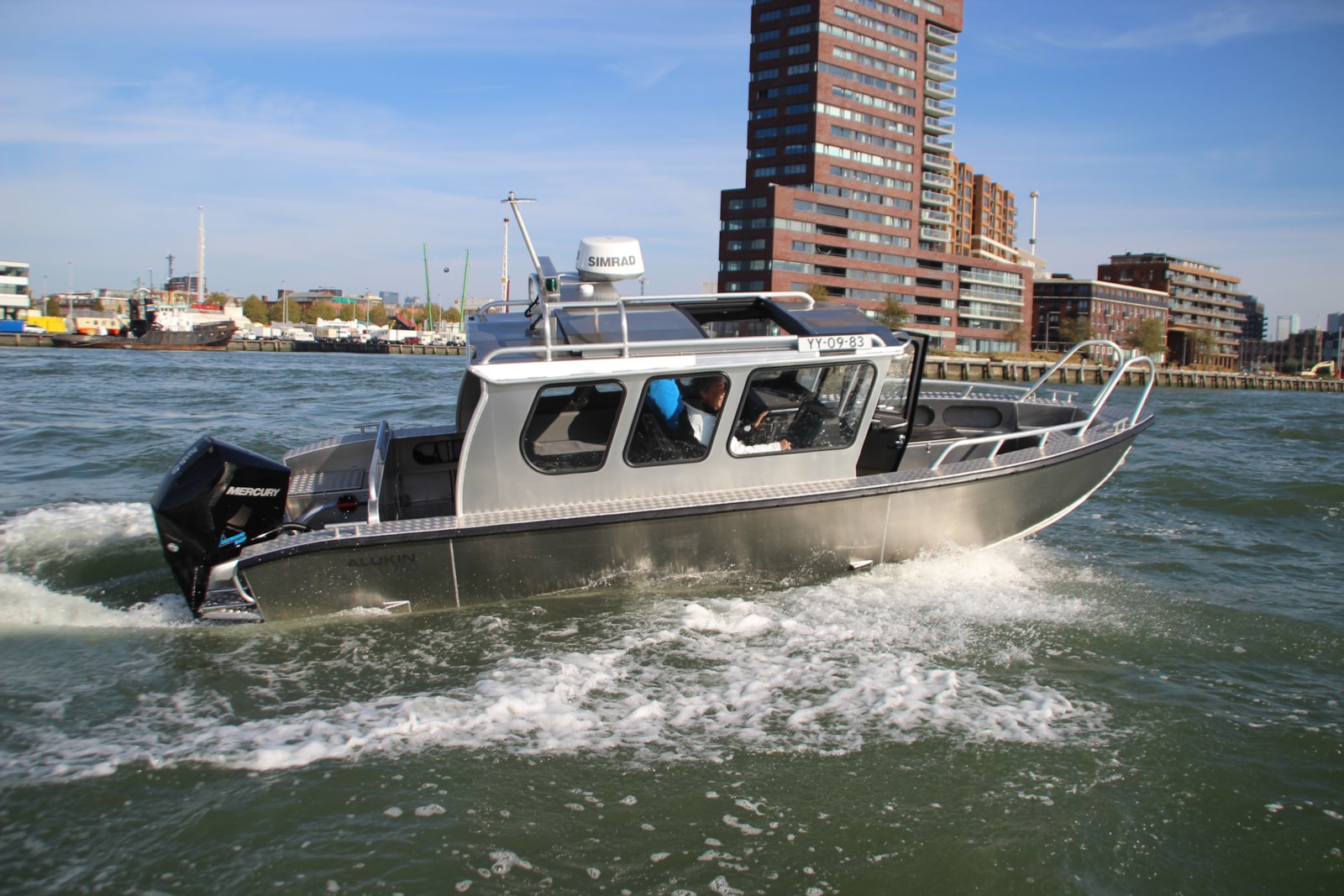 Aan de spiegel hangt een splinternieuwe 250 pk Mercury. Voor dit model Alukin is keuze uit buitenboordmotoren van 150 tot 300 pk. De geteste 250 pk V-8 is een moderne, enorm stille motor, die explosief reageert als je het gas opendraait. Met deze degelijke Zweed is het een genot om over de golven te springen en superstrakke bochten te draaien. Deze Alukin vaart als het spreekwoordelijke scheermes, waarbij je de boot in scherpe bochten haast plat op de zij door het water kunt jagen. In de dikke deining op de Nieuwe-Waterweg merk je dat het een snelle en degelijke boot is met fantastische gebruiksmogelijkheden. De top is 47 knopen, bijna 90 km per uur. Standaard is de Alukin Cabin 750 verkrijgbaar vanaf €65.000 incl. btw. De V8 van Mercury kost ongeveer 26k, dus de totaalprijs van de set ligt rond de 90 mille. Daarvoor heb je een stoere winterwonderboot, waarmee je het hele jaar door maximaal vaarplezier kunt hebben.