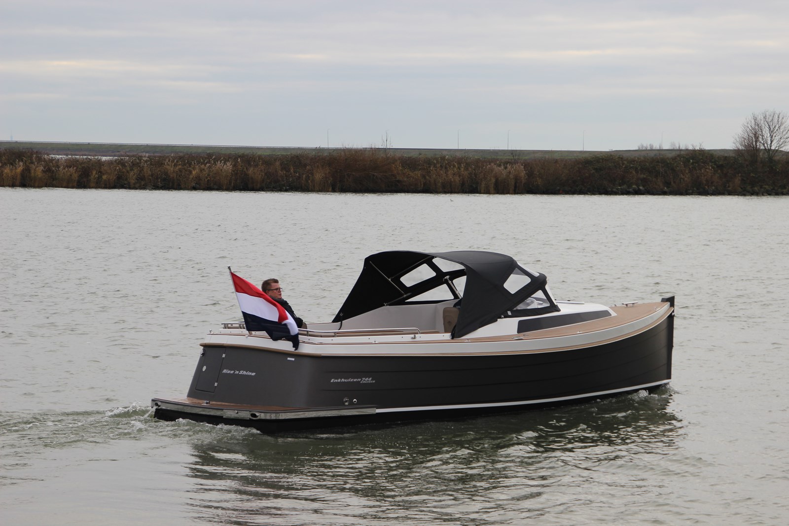 Op het IJsselmeer, merk je dat dit een gemakkelijk varende, degelijke tender is. Wel blijkt de schroef nogal te caviteren, een probleem dat nog door de werf wordt opgelost. Op de onrustige golven vaart de 744 opvallend droog en stuurt licht. Bijzonder mooi is hoe soepel de hydraulische keerkoppeling inschakelt. Voor de draaicirkel heeft de Enkhuizen 744 cruiser over beide zijden ongeveer twee scheepslengtes nodig (ca 15 meter). Achteruit volgt de boot de kiel en is dan met de boegschroef de gewenste kant op te krijgen. De 80 pk Nanni loopt rustig en accelereert prima. Als het gas wordt opengezet merk je de versnelling, maar steigert de boot niet. De topsnelheid werd geklokt op 20 km/u. Dit komt doordat de motor vanwege de vaarbewijssnelheid is teruggeschroefd. Eventueel is met dezelfde motorisering 32 km/u te halen. De Enkhuizen 744 cruiser toont zich als een ruime, moderne en vernuftige weekender met een mooie lijn, degelijk vaargedrag en een prima afwerking.