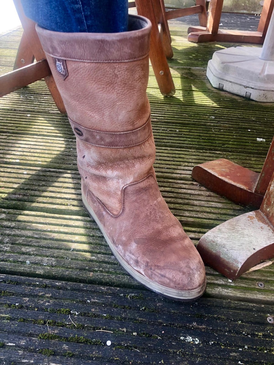 SCHEVENINGEN- Als deze Dubarry zeillaarzen konden vertellen, dan zou je waarschijnlijk ademloos aan de zolen blijven hangen. Het zijn niet zomaar een paar laarzen, het zijn de laarzen van Mark Slats die er non-stop de wereld mee is rondgezeild tijdens de Golden Globe Race. Voor het goede doel: Sailing4Cancer worden ze nu geveild.