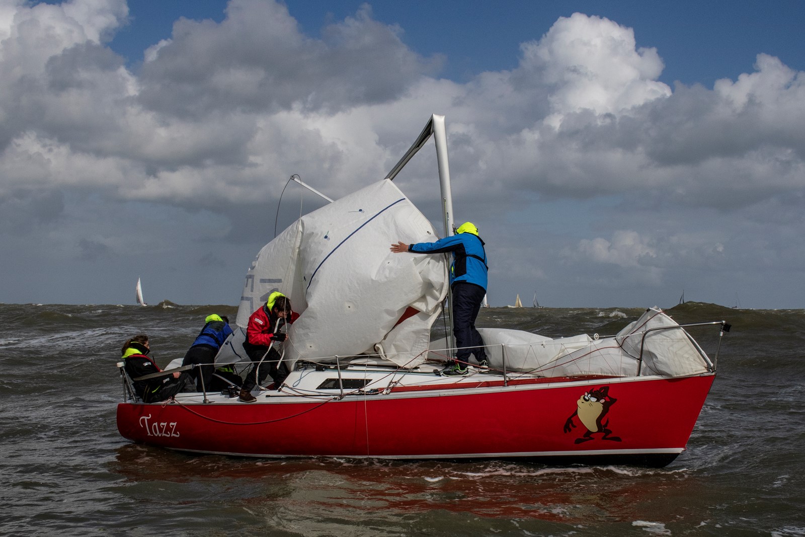 Zondag was er voldoende tijd voor minimaal één reeks door de profiteren van het lage tij, waardoor de wind iets af was genomen. Zestien van de meer dan twintig verwachte boten gingen de nog steeds onstuimige zee op. Door gebruik te maken van de bestaande betonning slaagde de organisatie erin een up en down parcours uit te leggen. Jan Gabriel van de Ragazza (IRC1): “We hobbelden vlot tegen de wind en de golven in met twintig knopen wind. Door de juiste keuzes lagen we redelijk snel aan de kop. Op de baan naar de benedenwindse boei kregen we een bui over ons heen. Bij ons ging de windmeter naar 30 knopen, sommigen anderen hebben 35 knopen gezien. Dit verklaart het uitvallen van de CR gemeten boten. En jammer genoeg is de mast op de RTazz naar beneden gekomen is. De onfortuinlijke boot is snel en veilig naar de haven gebracht,” aldus Gabriel, niet alleen winnaar van de dag in de IRC 1 categorie, maar ook nog voorzitter van de organisatie.