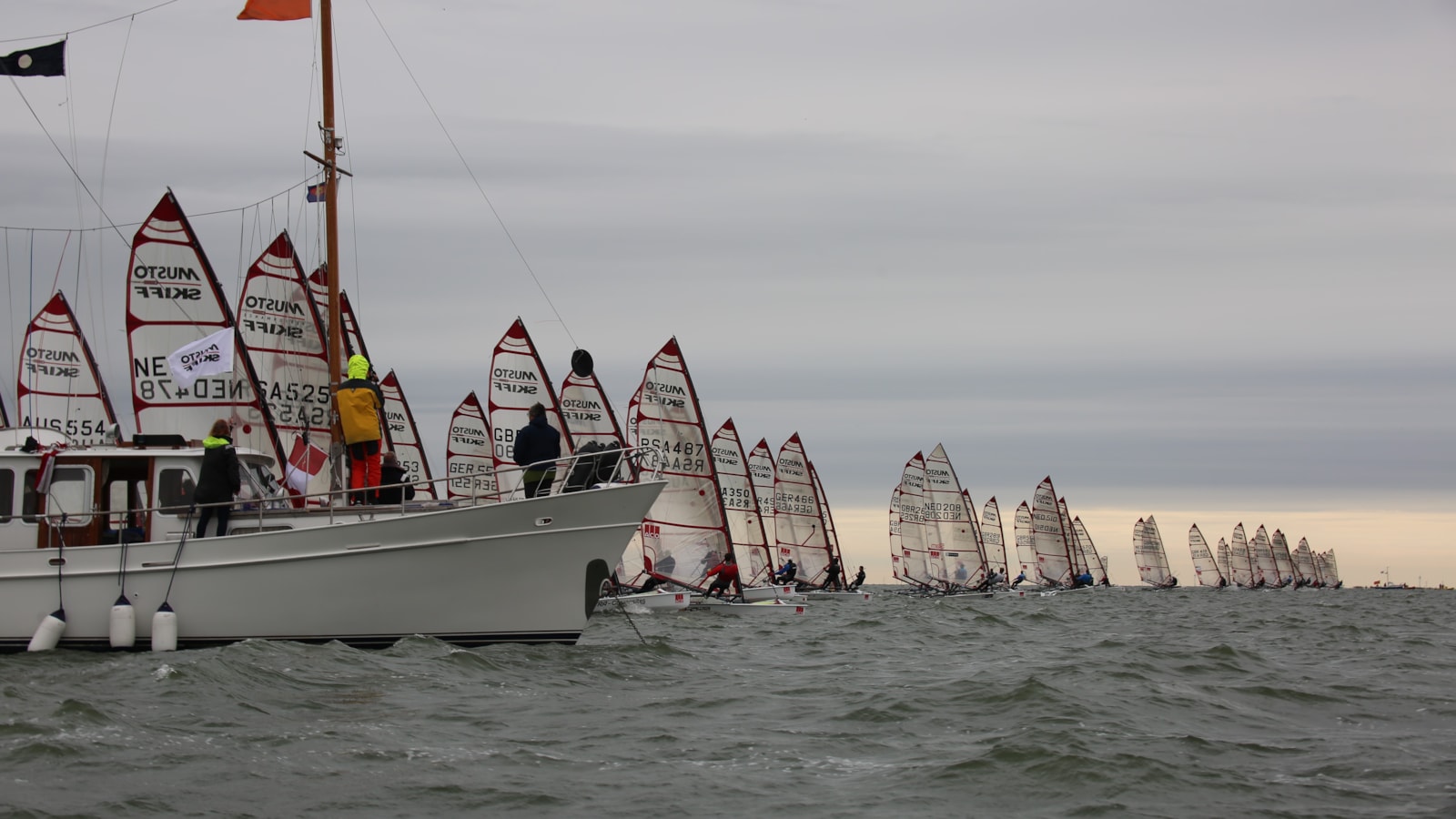 Het intensieve racen met 91 MUSTO Skiffs in één vloot begint zijn tol te eisen. Vandaag keerden twee zeilers met gebroken masten voortijdig terug naar de haven. Daar bood een Engelse zeiler een helpende hand. Eentje, want de andere zit sinds gisteren in het gips na een onfortuinlijke val bij het hijsen van de spi.