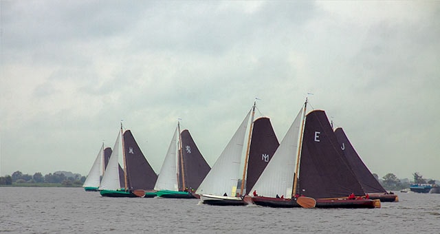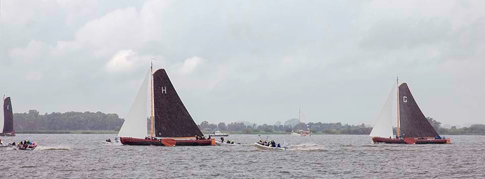 De skûtsjes voeren de eerste wedstrijd op het grote water van de meren gereefd vanwege de harde wind.