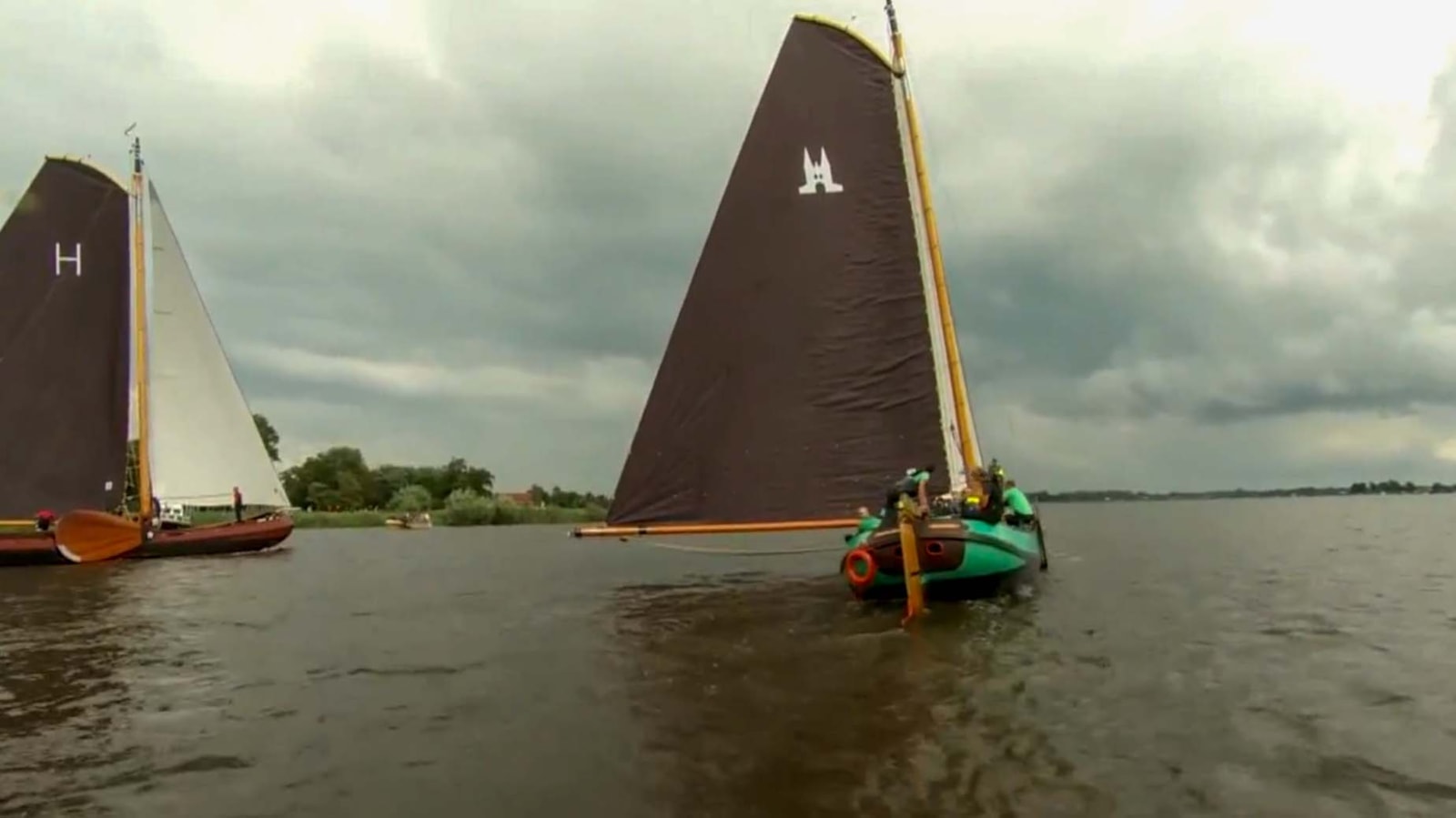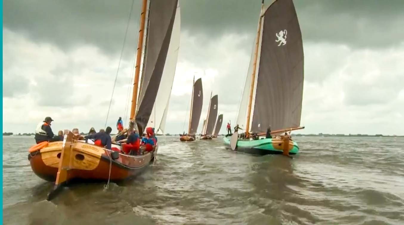 Onder de donkere regenwolken reppen de skûtsjes van de middenmoot zich naar de finish.