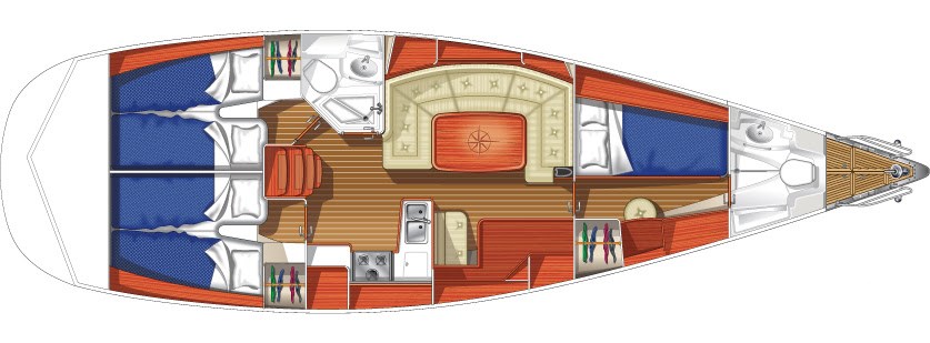 Het interieur van de Sweden Yachts 40 is ruimtelijk en praktisch. De standaard lay-out heeft 3 dubbele hutten, een grote salon, een kombuis en twee natte cellen. Bovendien is het, zoals een zeewaardig jacht betaamd, voorzien van een goede kaartentafel. De boot kan ook custom build, naar wens van de klant, worden geleverd. Deze mogelijkheid is uniek in het marktsegment van zeiljachten tussen 12 en 15 meter.