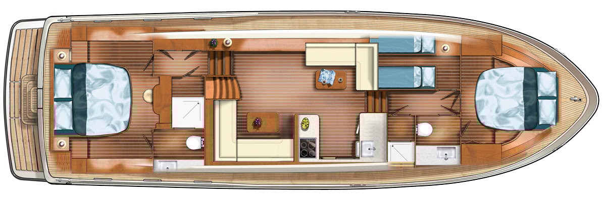 Met haar 14,95 meter lengte en 4,65 meter breedte is dit schip groter dan de 450 zodat er drie slaapcabines mogelijk zijn, maar iets korter en smaller dan de 500. De Grand Sturdy 480 AC Variotop® heeft net als de 500 zes vaste slaapplekken in drie cabines, een ruime salon met L-bank, en een grote pantry aan stuurboord. Aan bakboord bevinden zich de dinette en een ruime kastenpartij.