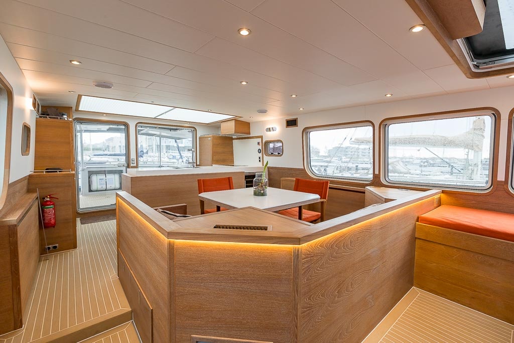 Kenmerkend voor dit schip is de enorme leefruimte die zowel boven- als benedendeks veel daglicht toelaat. Met drie hutten en twee natte cellen biedt de Korvet18LowRider plaats voor 6 gasten. De comfortabele lounge benedendeks staat in open verbinding met de stuurhut waar zich de keuken en eethoek bevinden. DKS B.V. in Hardinxveld-Giessendam heeft de afbouw verzorgd en het schip geheel in teak uitgevoerd. Opmerkelijk is de riante buitenkeuken met grill, kookplaat en spoelbak verzonken in een granieten plaat.