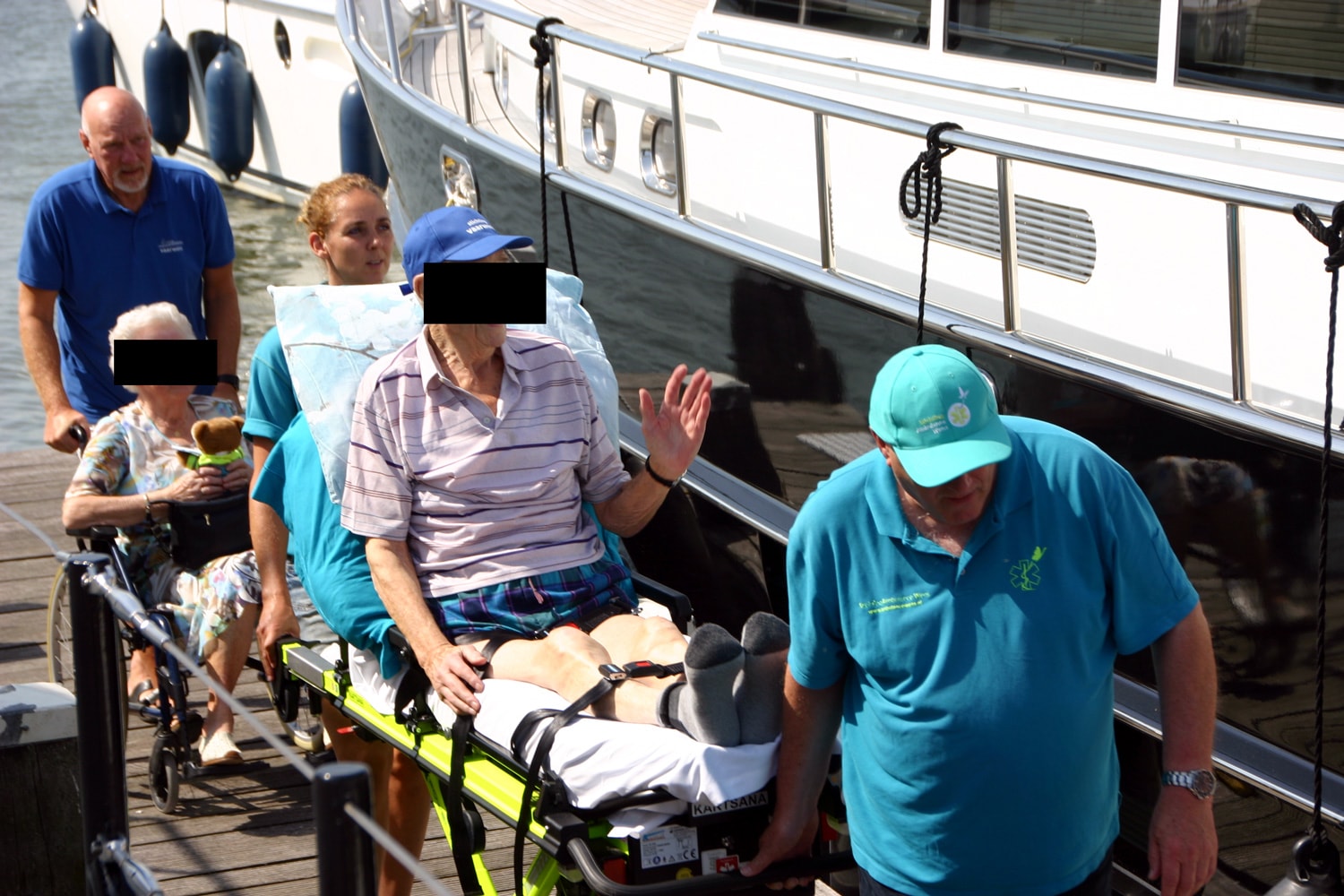 Als we de havenmond binnenvaren, is het een drukte van belang. Vele grote jachten zijn los en drijven door de haven. Daarna worden ze vijf dik voor de visserskade gestapeld en er valt geen onvertogen woord. Wij meren aan de buitenzijde van de steiger voor de visafslag aan en even later rolt de brancard over de loopplank de steiger op. Dan klinkt er gepast zacht applaus vanaf het achterdek van diverse schepen en onze medewatersporters wuiven vriendelijk naar de onfortuinlijke man op het bed met wielen en eenieder krijgt kippenvel.