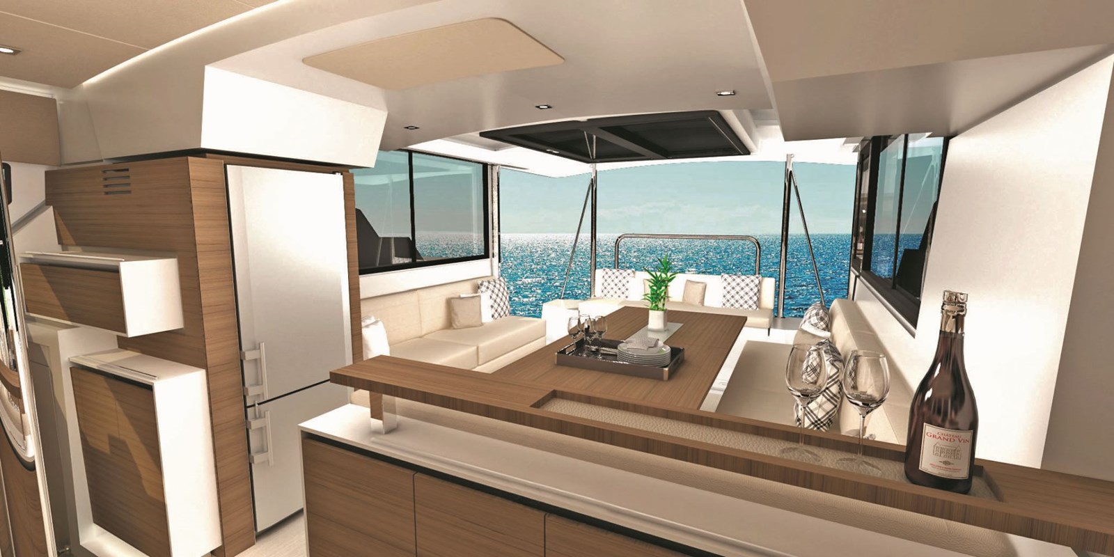 Deze Bali (zie video) heeft al enige 40 voeter een flybridge die je mooi met een veilige trap kunt bereiken. Je kunt ook goed bij het zeil en je hebt er prachtig overzicht. Op de flybridge heb je zonneplek voor vier personen en zelfs nog genoeg plek voor zonnepanelen.