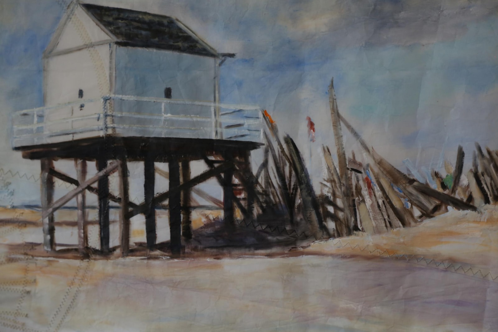 ”Zo’n vijftien jaar doe ik dit nu en het wordt steeds groter en groter. Ik heb een opleiding kostumiere gevolgd en ook schilderles gehad. Daar leerde ik schilderen met acryl en ik had een heel klein schilderijtje gemaakt van mijn vader met ons dochtertje die toen net kon lopen. Bij het schilderen van boten kwam ik op het idee om een zeil te gebruiken. Die techniek heb ik zelf uitgevonden. Zo moet je eerst een laag over het gladde zeil aanbrengen, anders houdt de olieverf niet. Vooral wedstrijdzeilen gebruik ik omdat zij het zeil keurig oprollen en dan blijft het redelijk netjes. Toerzeilen zijn meestal dikker en minder goed te bewerken. Het mooie aan werken met een zeildoek is dat je ook de ogen erin verwerkt, de stiksels en de gebruikssporen zijn te gebruiken. Ieder zeildoek is anders, het een is heel dik en dan zuigt de verf erin. Dan moeten er soms 3 lagen verf over heen. Het zeildoek span ik dus over het doek, de lijn van een stag ook langs de fok en zelfs de reefdraden verwerk ik erin. Dan dus de laag erover heen zodat het stroef wordt en de olieverf goed pakt.