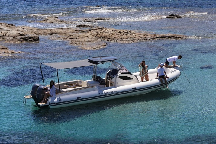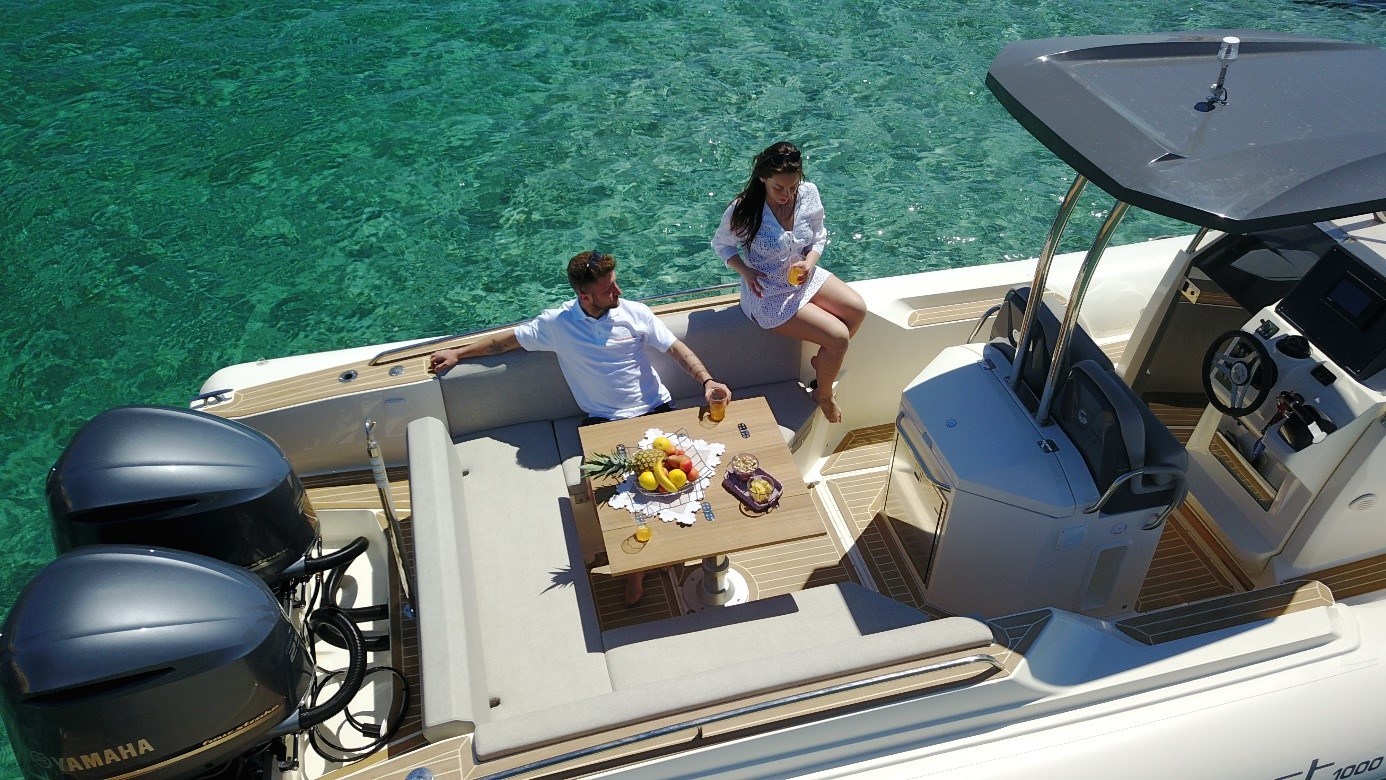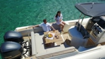 ’’Dit is een van de grootste boten in zijn klasse, maar het bijzonder zit hem vooral in de luxe uitvoering”, stelt Van der Eng. Zo is de RIB uitgerust met het helmmastersysteem van Yamaha, waarmee eigenaren de boot via een joystick kunnen besturen. Dat geeft maximale wendbaarheid en dat is een voordeel in havens en sluizen. De boot heeft een zitruimte achter, een zwemplateau, een buitenkeukentje met koelkast, een toilet en zelfs een slaapaccommodatie onder stuurconsole. Op de RIB kunnen met gemak zes tot acht personen meevaren.’’