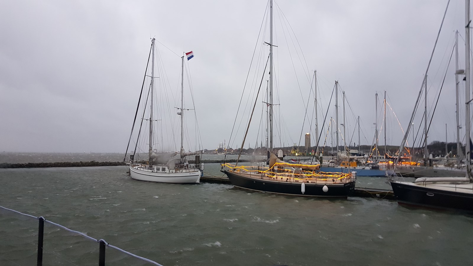 Na het ontwaken wordt het al snel onrustig op de steigers. Er is storm voorspeld en velen beraden zich over hoe hun schip goed te zekeren. De storm zal uit het zuiden komen, dus liggen we met de volle haven aan lagerwal. Al snel doen sterkte verhalen de ronde over de januaristorm dit voorjaar, waarbij schepen lossloegen en er zowaar een losgeslagen viskotter de jachthaven binnen dreigde te drijven.