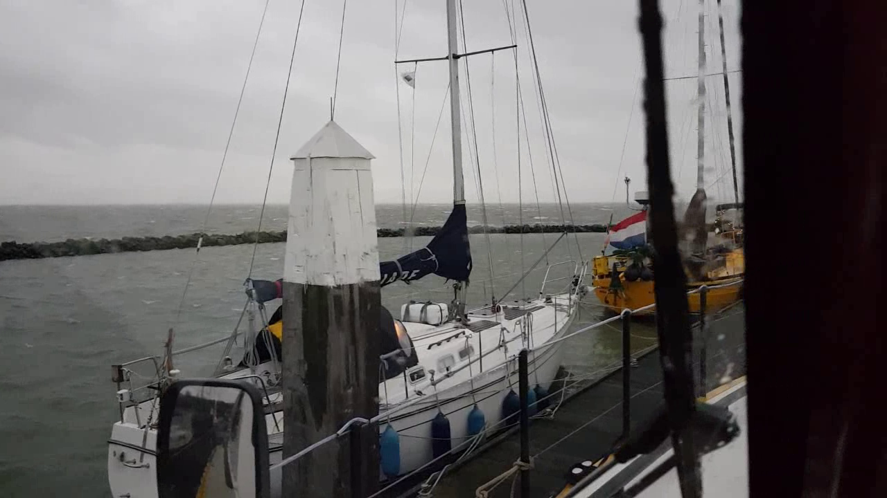 Sommige schippers worden nerveus, gaan verkassen om een beschutter plekje te zoeken, zijn aan de gang met trossen en lijnen. “Vertrouw niet op die boldertjes hoor… Die zitten alleen met vier boutjes aan een plankje!” roept een ‘ervaringsdeskundige’. Vertwijfeld knoopt hij de lijn om een grote meerpaal. “Zo… die trek ik de grond niet uit!” antwoordt de man zelfverzekerd. Weer anderen maken zich nergens druk om en vertrouwen op het gammele meertouwtje waar hun hele hebben en houwen aan vast zit…