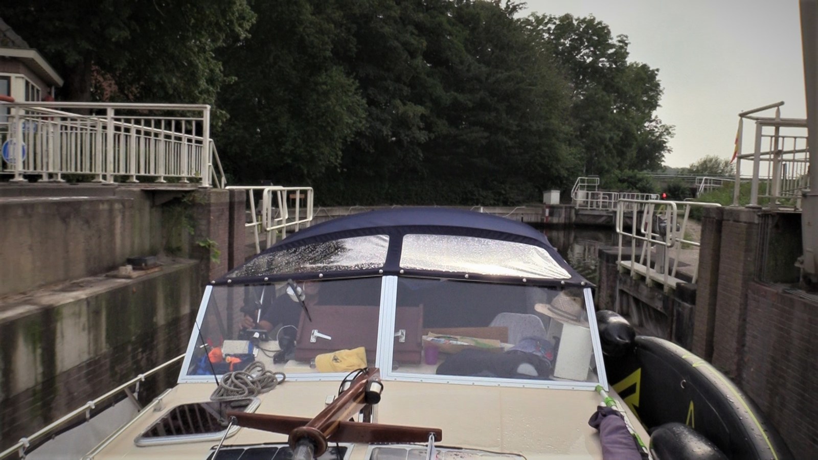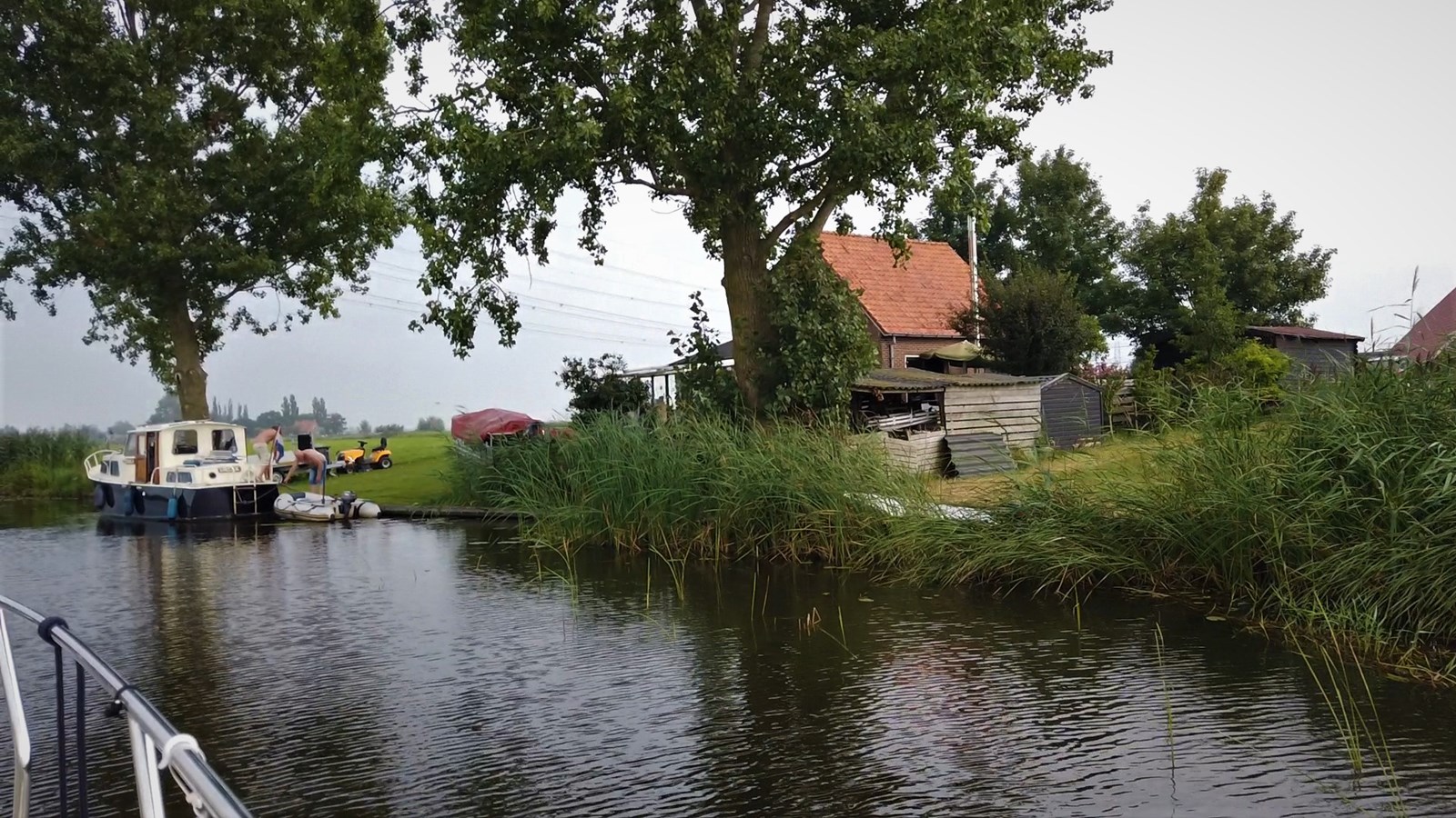 Rustig tokkelend varen we richting Schoterzijl. Het haventje voor de sluis, ligt vol met motorboten. Het is er gezellig druk. Bij de sluis, die open staat, springen jongeren vanaf de brug te water. Het is broeierig warm. Iedereen lijkt met dit warme weer te willen zwemmen. Maar boven het landschap voor ons wordt de lucht steeds donkerder. Het is nog droog, maar de vraag is: hoe lang nog? Voor de zekerheid ritsen we de kuiptent dicht. Terwijl we bezig zijn, horen we de eerste druppels op het tentdak tikken, gevolgd door een enorme plensbui. We zijn precies op tijd om de boot van binnen droog te houden. De ruitenwisser draait op volle toeren als we een weg zoeken door het smalle, met riet omgeven vaarwater.