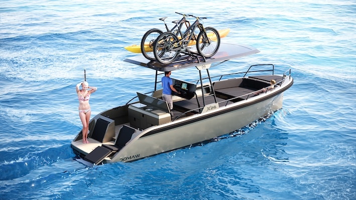 En dan is er de Domani X26, de eerste volledig elektrische SUY. Gebaseerd op de efficiënte romplijnen van de DOMANI E32, is de X26 gemaakt van gerecycled aluminium en met het oog op een 100% recyclebaar einde van de levensduur. Op een mooie zomerdag kan ze één op één cruisen op zonne-energie. De werf komt op korte termijn met aanvullende informatie. Een voorproefje hierbij.
