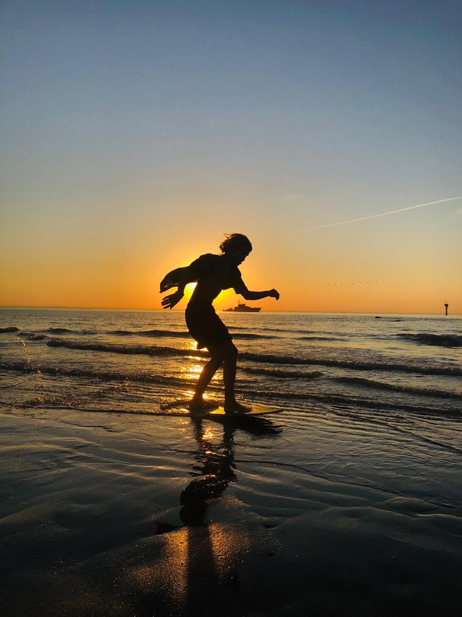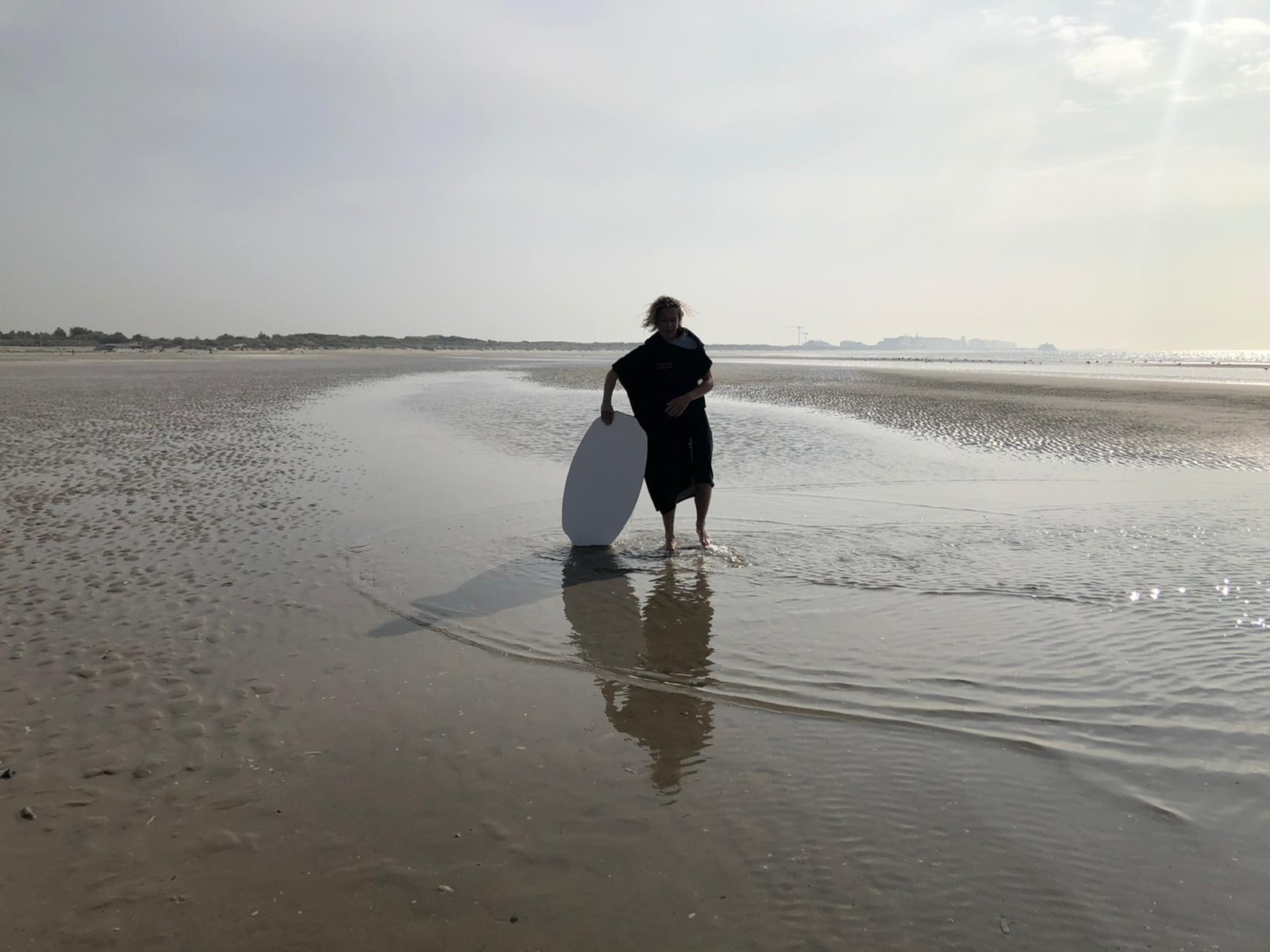 Drie jaar geleden ontdekte Daan het skimboarden door zijn Peter die een board had gekocht voor zijn neefjes. ”k mocht het board ook even uitproberen en was direct enthousiast. Via filmpjes op YouTube leerde ik verschillende tricks. Bij het skimboarden gooi je het board voor je uit over een dun laagje water en vervolgens spring je op het board en probeert zover mogelijk te glijden. Als je dit een beetje onder de knie hebt, kun te proberen over een rails of obstakel te gaan.”
