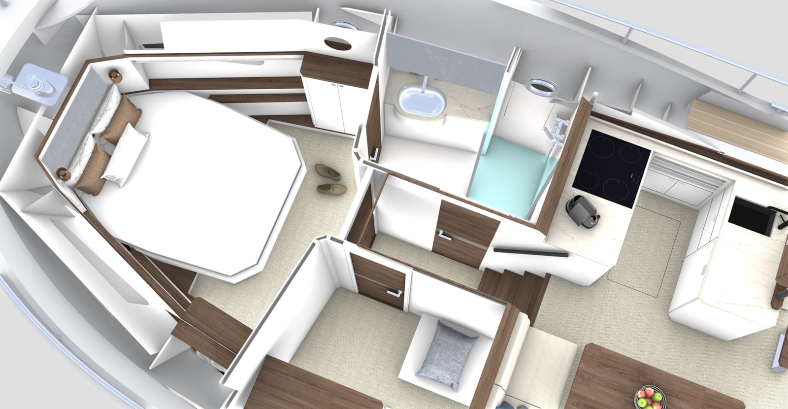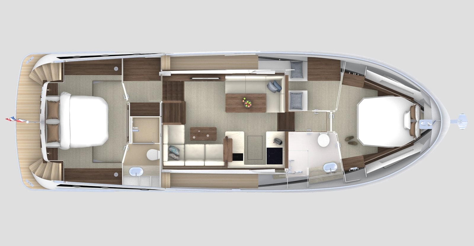 Deze moderne Boarncruiser Elegance AC is een waar ruimtewonder! De zeer ruime en uiterst efficiënte indeling met 3 cabines en 6 vaste ligplaatsen.