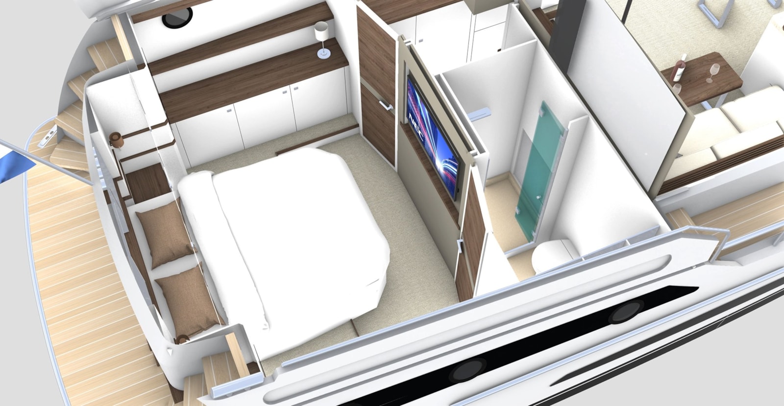 De absolute hoogtepunten van Boarncruiser Elegance AC zijn de vele slaapmogelijkheden voor haar lengte (6 + 2), gecombineerd met 2 ruime natte kamers en de grote keuken welke volledig uitgerust kan worden met een ruime keuze aan keuken apparatuur. Er is ruimte voor een wasmachine / droger combinatie en er is ook een servicedeur van de achterste cabine naar de machinekamer.