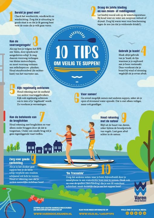 Stand Up Paddling, kortweg suppen, is op dit moment zonder meer de snelst groeiende vorm van watersport. Steeds meer mensen stappen op een sup. Logisch, want het is een laagdrempelige manier om actief op het water te zijn, of juist om te ontspannen. Om veilig te kunnen suppen heeft Varen doe je Samen een flyer gemaakt met tien tips die we graag met je delen. Ga je voor het eerst suppen, volg dan eerst de online cursus op Watersport-TV.