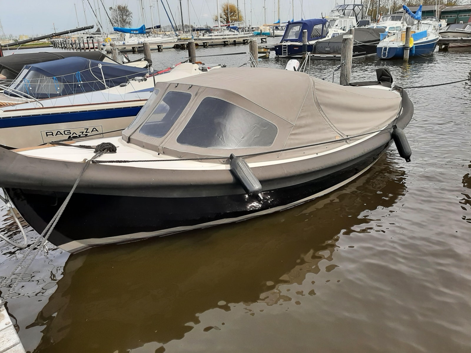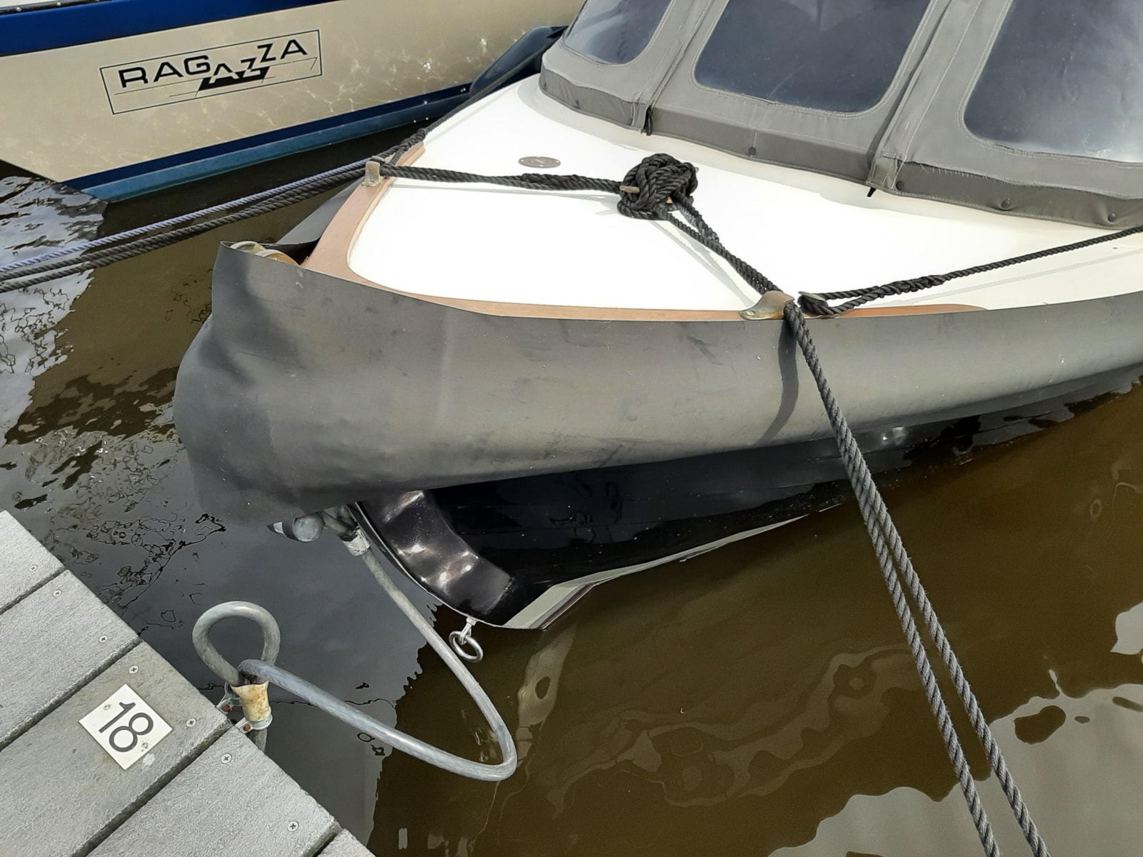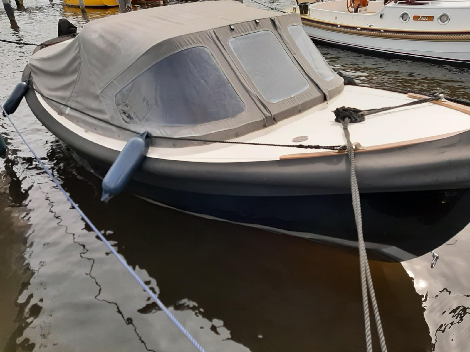 De eigenaar van de sloep op de foto is duidelijk zuinig op de kabelaring om zijn boot. Om de stootlijst tegen UV-licht en weersinvloeden te beschermen, wordt na ieder vaartochtje een hoes over de kabelaring getrokken.