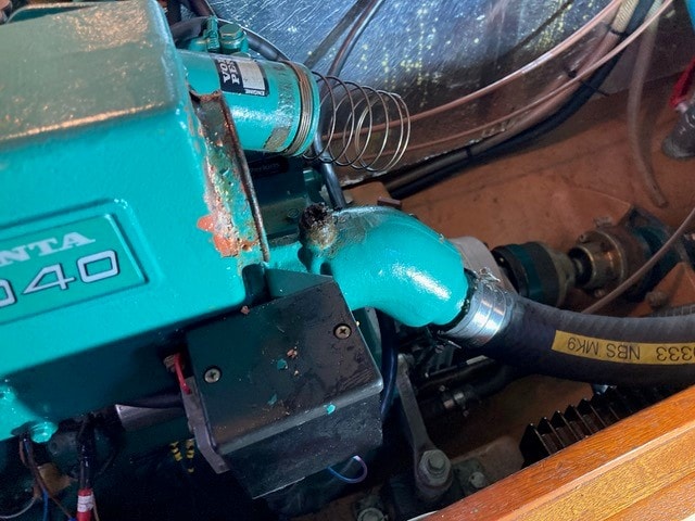 6, Het belangrijkste is het openmaken en schoonmaken van de afvoer van het buiten koelwater naar het spruitstuk, zodat het buitenwater weer ongehinderd met de uitlaatgassen afgevoerd ken worden (foto 4 en 5)