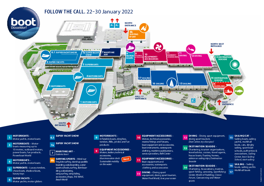 In hal 16 en 17 zullen de harten van de zeilliefhebbers hier sneller gaan kloppen: alle bekende fabrikanten van zeiljachten in alle maten en klassen zijn weer van de partij en zullen laten zien wat er de afgelopen twee jaar op zeilbootbouwgebied is gedaan. Bavaria, Hanse, Bénéteau of Hallberg Rassy zullen weer aan boord zijn met hun hele repertoire van 22 tot 65 voet.