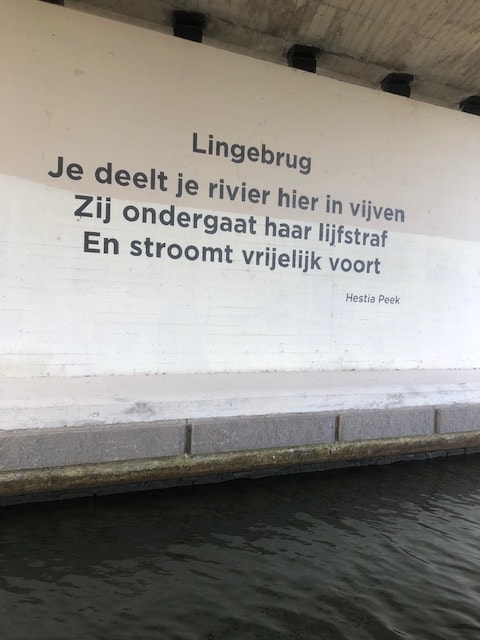 LEERDAM- Jachthaven De Oude Horn in Leerdam is prachtig gelegen aan de Linge. Net voor de haven vaar je onder een brug door, die rijkelijk is voorzien van prachtige gedichten. Deze gedichten zijn geschreven door de lokale dichteres Hestia Peek.