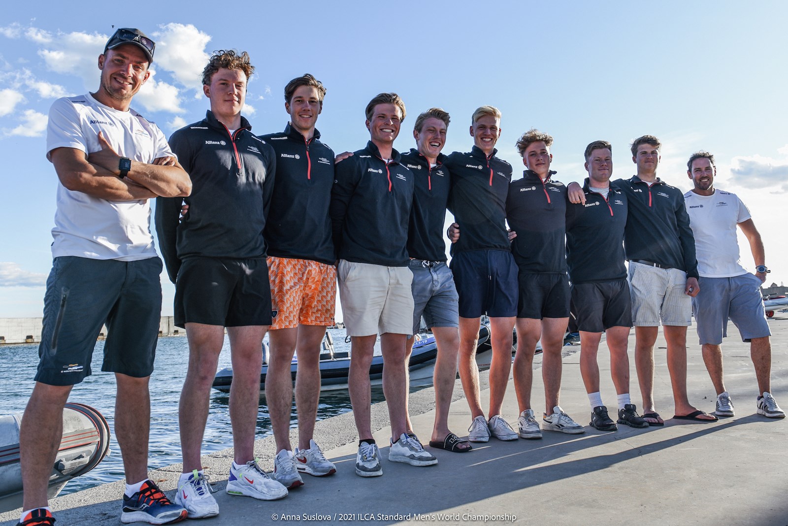 Team Allianz op WK ILCA7 vlnr: Roeloef Bouwmeester (coach) Thomas van Ofwegen, Erik Voets, Marnix Bos, Duko Bos, Willem Wiersema, Paul Hameeteman, Niels Broekhuizen, Teun Binkhorst en Rodie van Mackelenbergh (coach). Fotograaf Anna Suslova.
