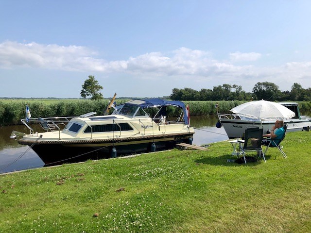 Het eerste stuk van de haven heeft geen- of slechte beschoeiing, dus wij varen ver de haven in, waar er wel een redelijke beschoeiing is. Dat maakt het in- en uitstappen wat makkelijker. Al blijft het een flinke hoogte om van onze boot op het gras te komen. In de haven zijn beperkt loopplanken beschikbaar die op de beschoeiing passen.