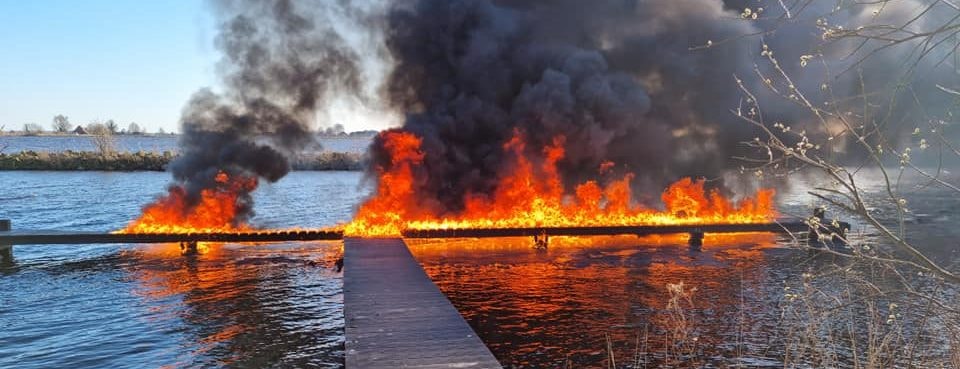 Afgelopen zaterdag 19 maart is er brand geweest aan de steiger TJ15G aan de Marchjepôlle in het Tjeukemeer. Een groot deel van de steiger is afgebrand. Om te voorkomen dat het kunststof zich verspreidt door het water, heeft de brandweer olieschermen aangebracht.