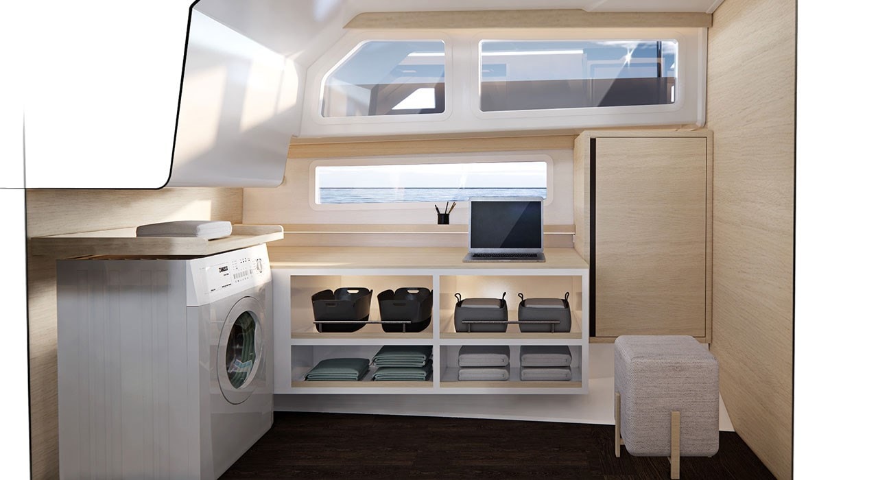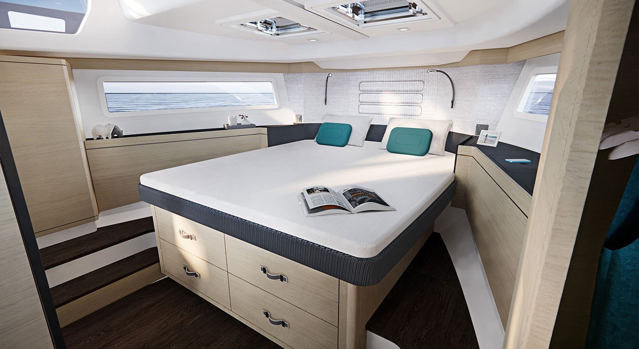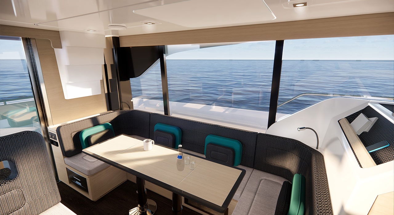 De kajuit is lekker licht en is op gemak en relaxen gericht ontworpen. Buiten de verschillende hutten kun je ook nog een slaapplek maken van de L-bank rond de tafel aan bakboord en daar is zelfs gedacht aan een privacy gordijn. Aan stuurboord is de kombuis met elektrisch kooktoestel, koelkast, lades en een kunststof aanrechtblad. Overal is lichte stoffen bekleding gebruikt, waardoor het geheel bijzonder rustig oogt. Bijzonder is het glazen luik op de motorkamer, waardoor je ziet hoe mooi de techniek is geïnstalleerd. De werf krijgt veel vragen naar deze doorkijkplaat maar helaas is deze alleen voor tentoonstellingsdoeleinden ontwikkeld en niet te bestellen. De stuurplek is precies zoals je mag verwachten: comfortabel en geschikt voor zowel zittend als staand sturen. De bestuurdersbank is breed genoeg voor 2 personen en de schuifdeur ernaast is superhandig bij het afmeren.