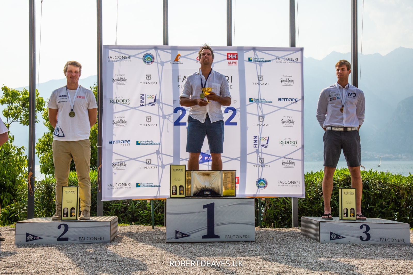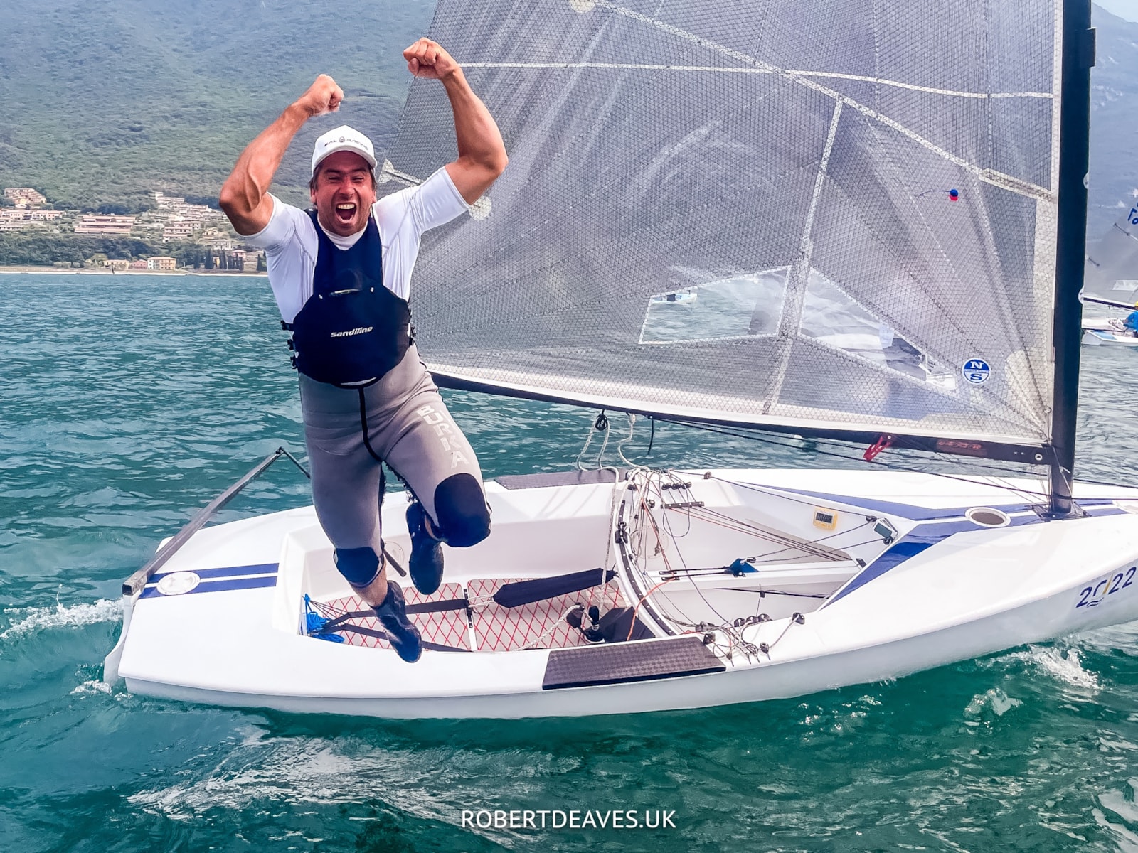 ”Dit voelt goed. Dit voelt geweldig. Dit is een heel speciaal moment om hier met deze hele Finn-familie te zijn. Om met deze boot te zeilen, om met snelheid te gaan, downwind, upwind, om de starts te nemen met deze familie van 110 concurrenten is een heel speciaal gevoel dat ik in mijn hart sluit. Zoveel mensen hebben mij onderweg gesteund. Het is geen cliché maar we doen het met een heleboel mensen samen en denkend aan een paar mensen in de lucht en de mensen om me heen, dit is voor ons allemaal en het voelt geweldig. Het was een geweldig evenement hier in Malcesine met goede vrijwilligers, en een klasse met 110 boten op de lijn. De Finn zal nooit sterven.”