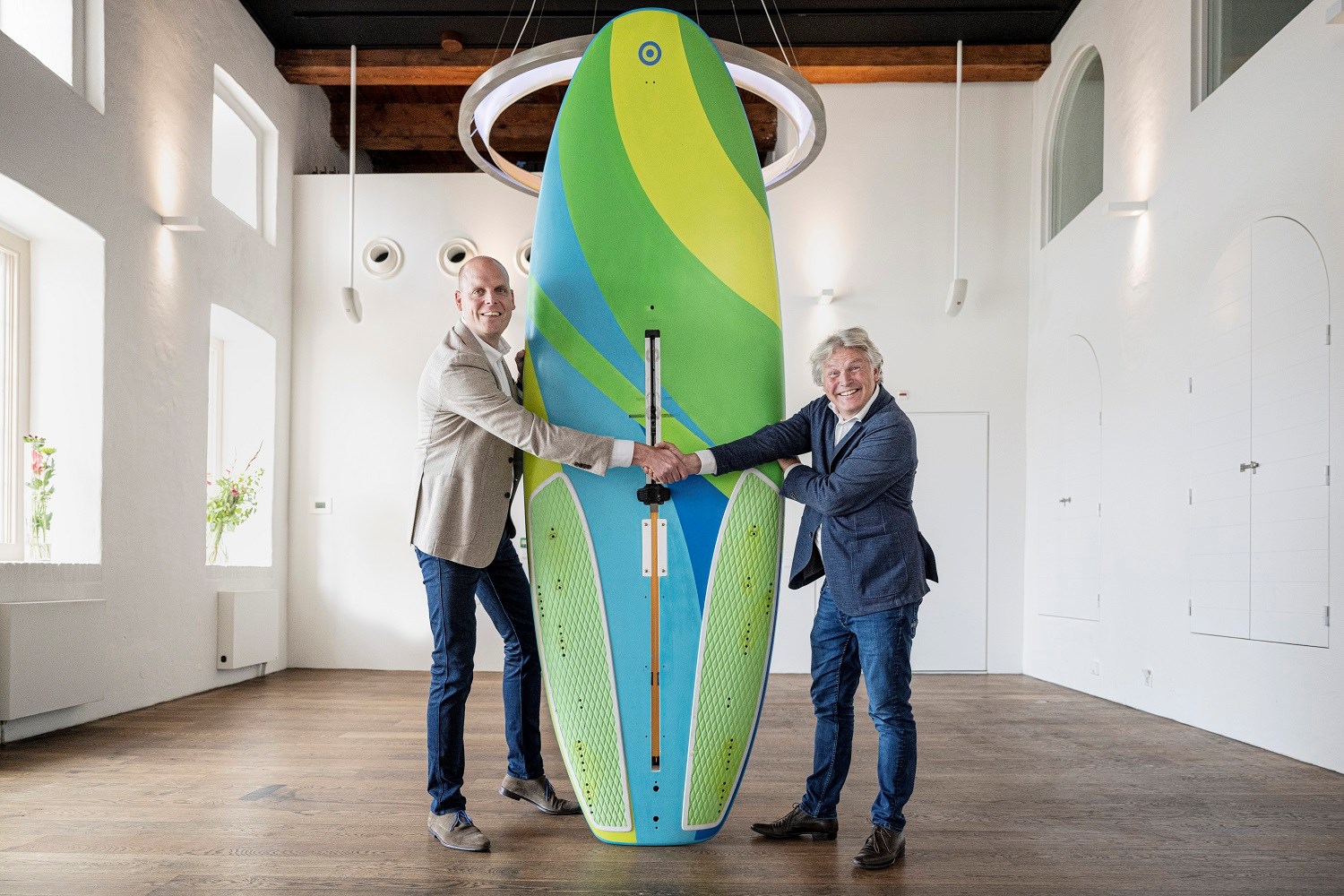 Foto: Arno van Gerven (links), directeur van het Watersportverbond en Michael Huijser, directeur Scheepvaarmuseum met het RS:X board waarop Dorian van Rijsselberghe in 2016 goud behaalde op de Olympische Spelen in Rio. Fotocredits: Leonard Faustle