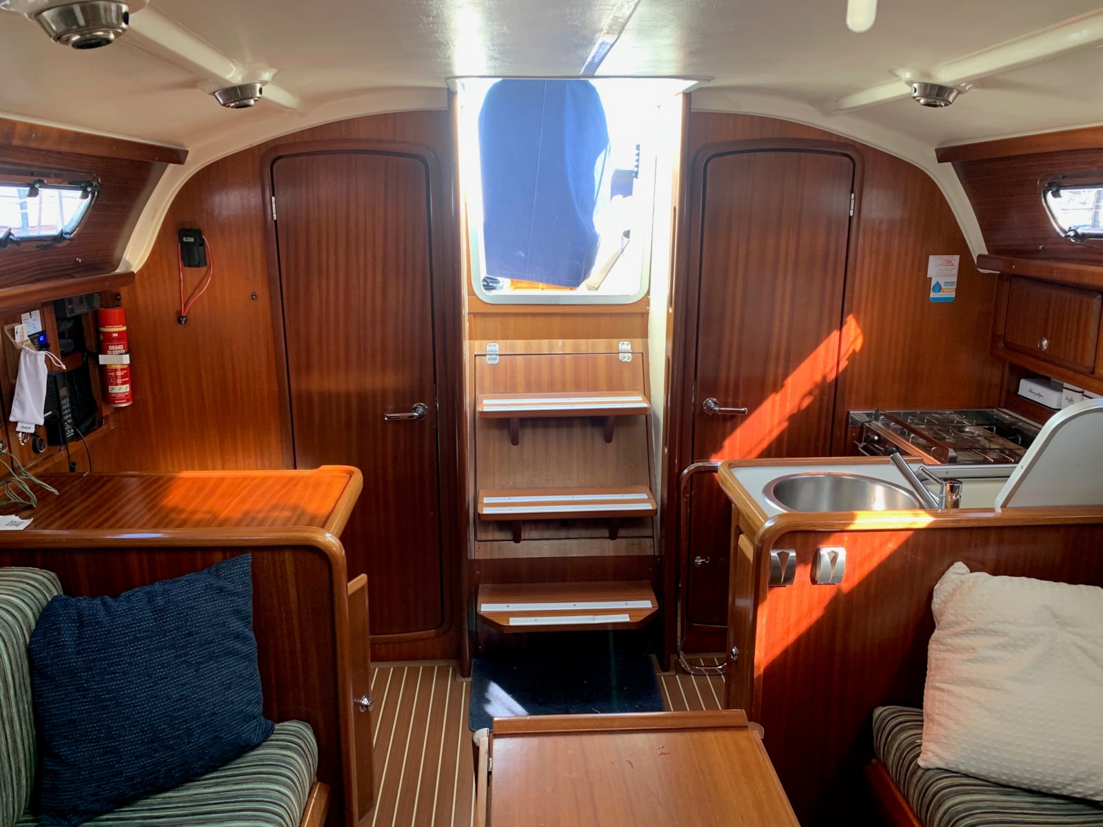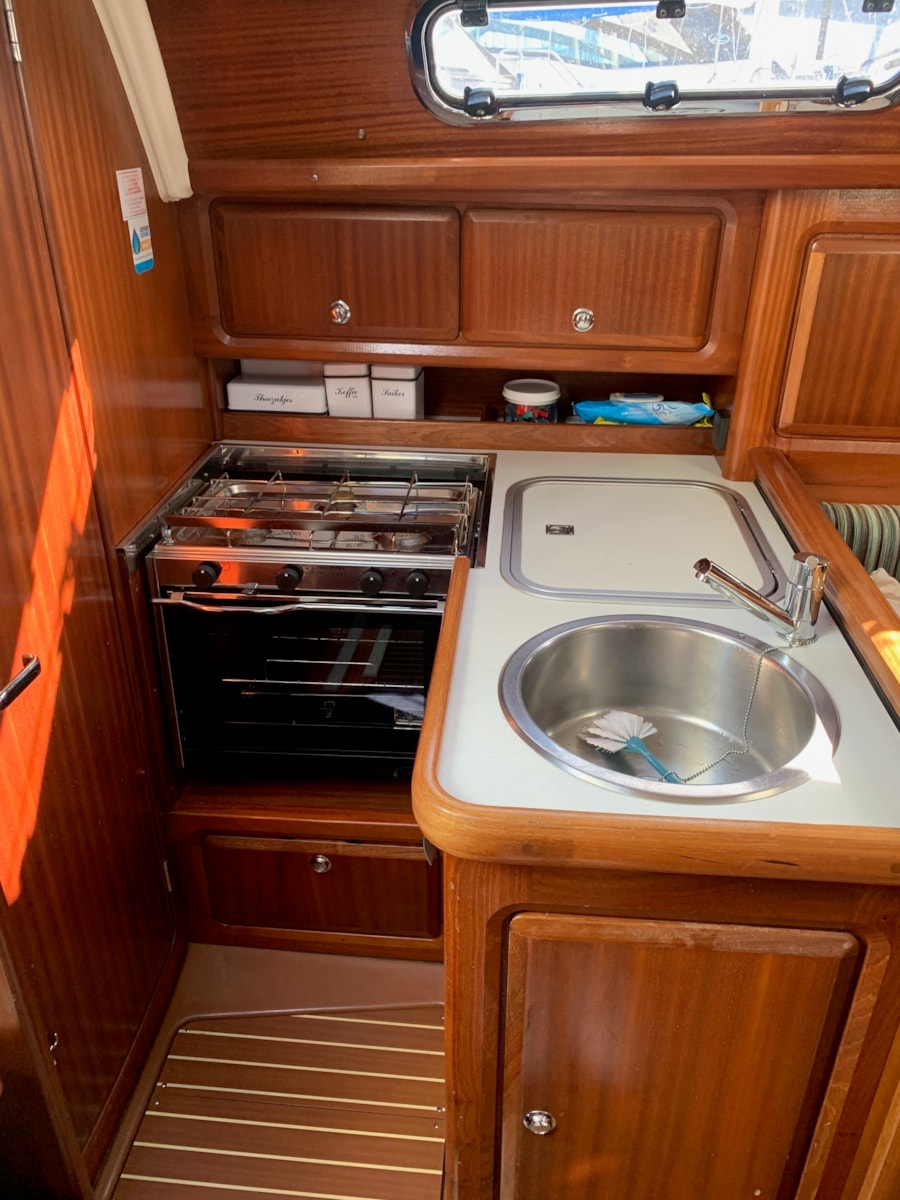 De praktische en ruime kuip van deze Bavaria 34-3 is voorzien een buiskap met aanritsbare kuiptent. De buiskap is in 2021 gereinigd, opnieuw gestikt en voorzien van nieuwe ramen. Vanachter het roer heb je een goed overzicht en controle over de boot. Op de stuurstand zijn de navigatie-instrumenten ingebouwd met onder meer de bediening voor de autopilot en een Raymarine ES95 kleuren kaartplotter. Het zwemplateau met buitendouche is gemakkelijk bereikbaar dankzij de uitneembare achterbank. Het interieur met stahoogte in de salon is ruim en praktisch ingericht met een uitstekende afwerking van het mahonie houtwerk en heeft veel kastruimte. De gezellige salon is uitgerust met twee grote en comfortabele banken waarvan de bekleding in 2022 geheel is vernieuwd. Alle interieurverlichting is uitgevoerd in warm wit LED. De L-vormige keuken aan bakboord is ruim en modern ingericht en uitgerust met een 3-pits fornuis, oven, Nespresso koffiezetapparaat, compressor koelkast en een gootsteen waarvan de kraan in 2022 is vernieuwd. De boot wordt geleverd inclusief het complete keukeninventaris en servies in goede staat.