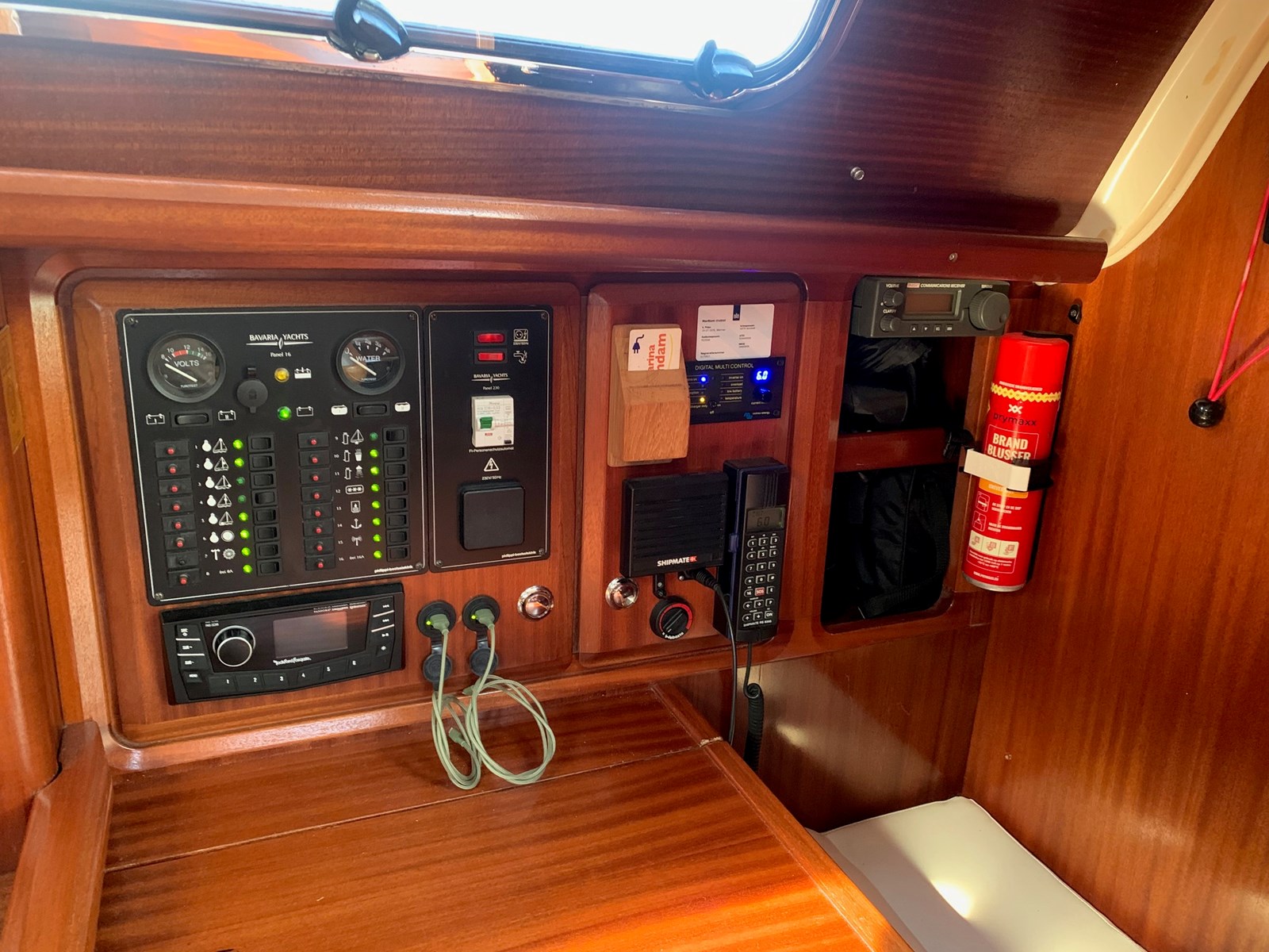 Aan stuurboord vind je de kaartentafel met schakelbord, marifoon, USB-laders, het omvormer controle paneel en een radio.