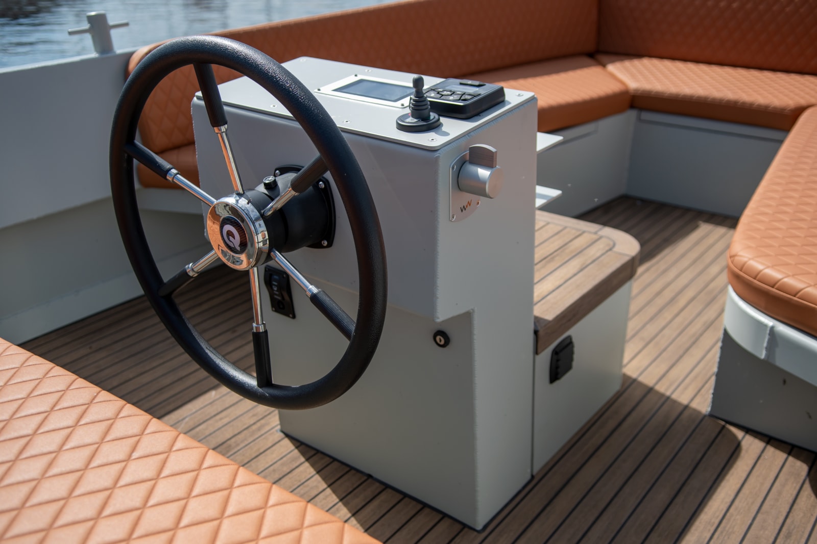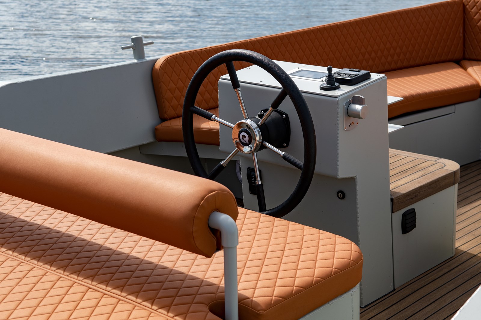 Voor de console is een kleine tafel die de afdekking van het motorcompartiment vormt. Voorin is een U-vormige bank voorin met volop bergruimte er onder. Ook onder het voordek en het achterdek is plek voor de kussens of andere spullen. Jammer is dat opstaptreden ontbreken, waaronder je de fenders en landvasten gemakkelijk en snel zou kunnen opbergen. Daar wordt nog aan gewerkt. De elektromotor heeft een vermogen van 4kW en er zijn ook vermogens voor 7,5 of zelfs 10kW mogelijk. Die zijn meer bedoeld voor de grotere modellen zoals de e-Qruiser 800 die op stapel staat. Een elektromotor van 4kW is voor de 600 echt genoeg. Het koppel is groot en de motor is fluisterstil