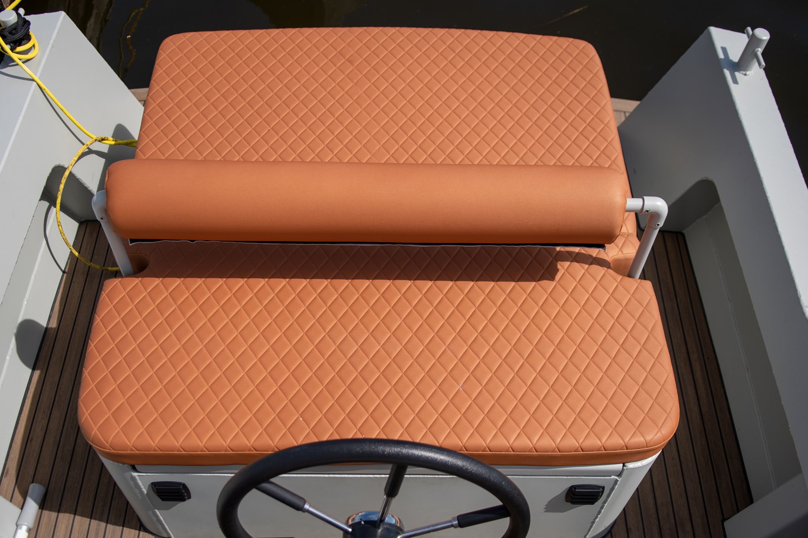 De indeling is van een moderne tender, met een groot zonnebed achterop en een vrije doorloop naar het zwemplateau. De ruimte onder het zonnebed is in tweeën gedeeld. In het achterste deel is veel bergruimte en vind je achteraan de onderdelen van de besturing. Onder de voorkant van de bestuurdersplek is een geventileerde ruimte voor de accu’s. Het technische deel is heel netjes geïnstalleerd. De stuurconsole is overzichtelijk met een Waterworld scherm, de radio en schakelaars voor de elektrische onderdelen aan boord. Om het display beter af te kunnen lezen is een iets grotere hellingshoek aan te bevelen. Verder ontbreekt een plek voor kleine spullen zoals de telefoon en de autosleutels. Wel zijn er voor de console vier bekerhouders geplaatst.