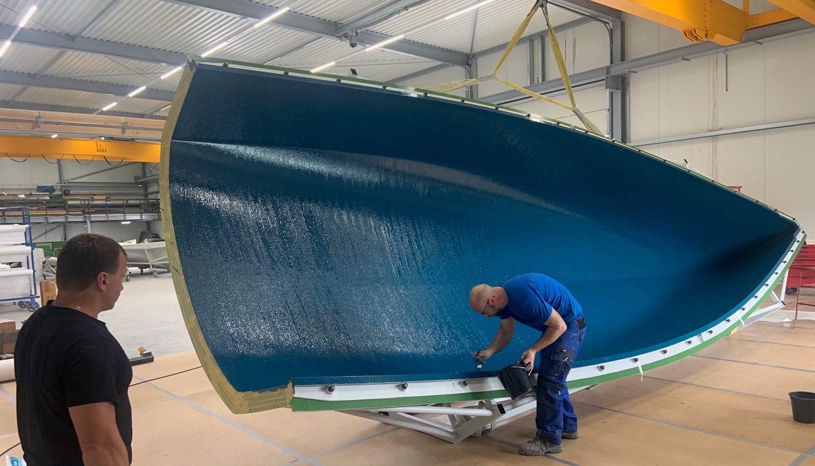 Geert Wijma, eigenaar van de werf: ’’We hebben de mallen van romp en binnenschip op de werf en de eerste producten zijn gebouwd. Het interieur wordt geassembleerd in de romp en we verwachten dat volgende week de eerste boot (romp/interieur) kunnen ontmallen voor assemblage. We gaan nu beginnen met het lamineren van het dek met in-mould Esthec vloer. Kiel en roeren zijn onderweg, evenals mast, zeilen en technische delen. We zijn blij met de vorderingen.’’