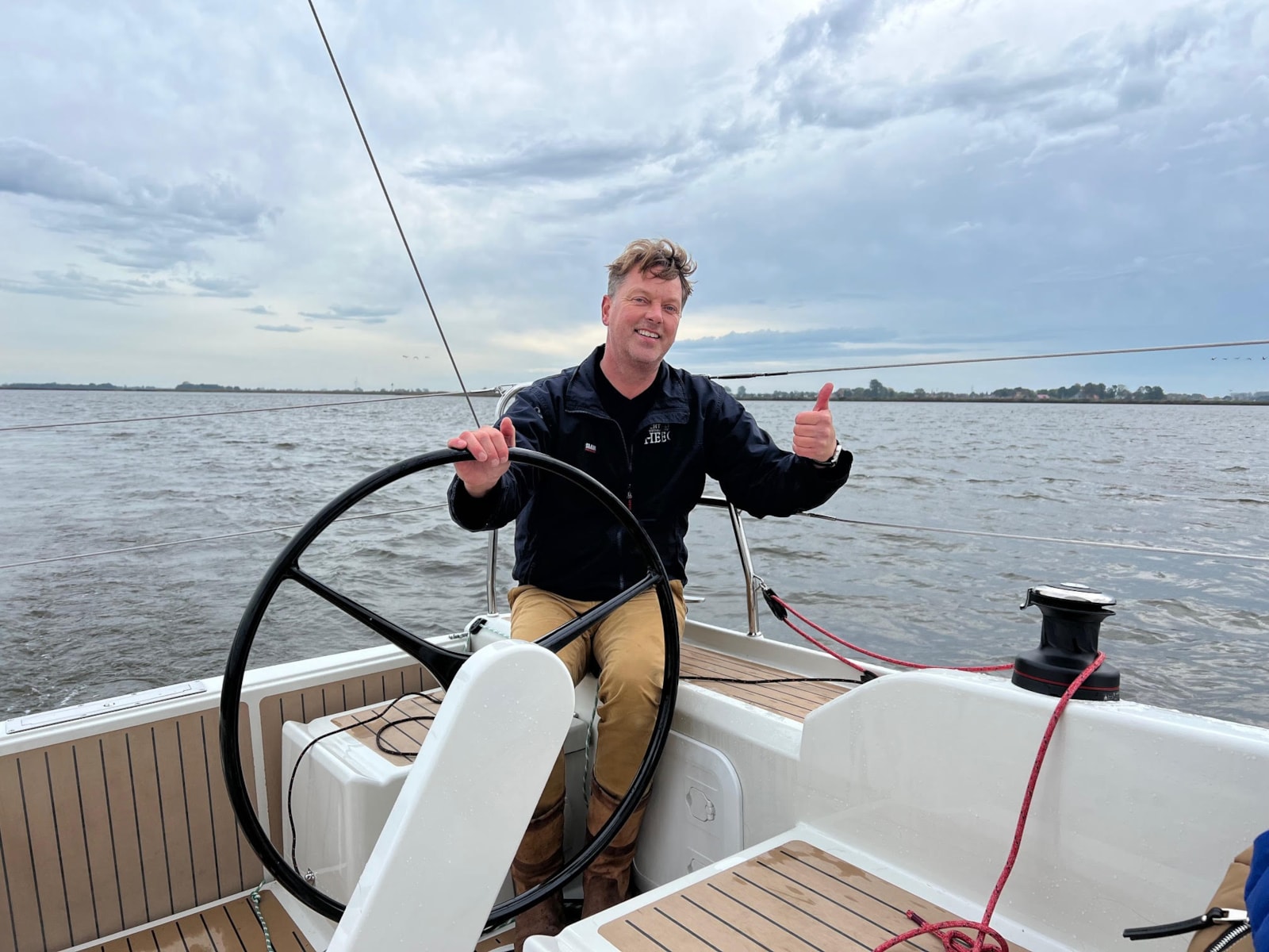HEEG- Een grote smile op het gezicht en de duim omhoog bij Geert Wijma, eigenaar van Jachtwerf Heeg, tijdens de eerste proefvaart met de splinternieuwe Pointer 30. De afgelopen weken is door zijn crew nog hard gewerkt om de nieuwe aanwinst zeilklaar te krijgen.