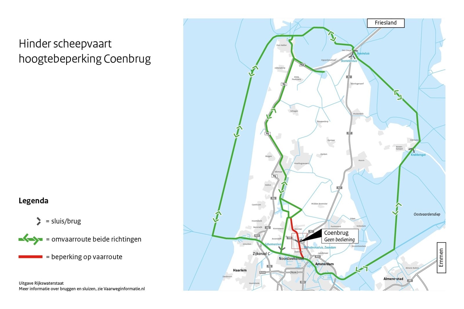 Over de status van de defecte Coenbrug in Zaandam is nog niets bekend gemaakt. Op 4 mei 2021 is er een storing opgetreden aan de Coenbrug in de A8 bij Zaandam waarbij er ernstige schade is ontstaan aan de bewegende delen van de brug. Daardoor kan de brug sindsdien niet meer geopend worden. Dit levert hinder op voor de scheepvaart: er geldt een langdurige vaarwegbeperking in de doorvaarhoogte van 6.20 m voor minimaal twee jaar.